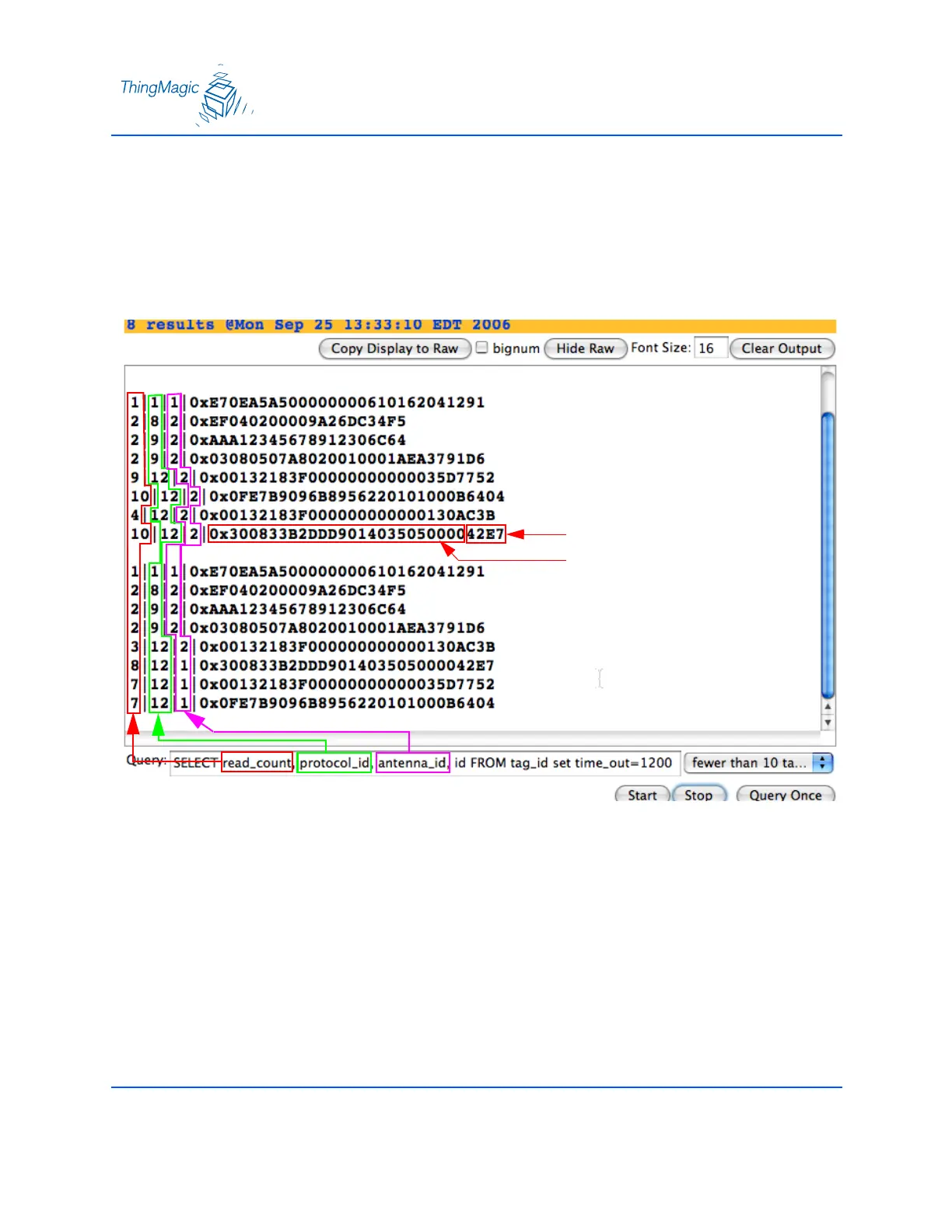 output returned from the query. Each row in this example shows reader, protocol, antenna, tag