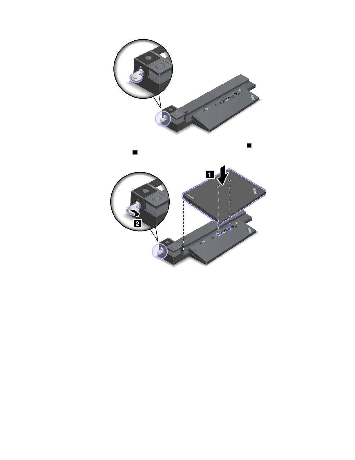 2. Attach your computer to the docking station as shown until you hear a click 1 . Turn the system lock key