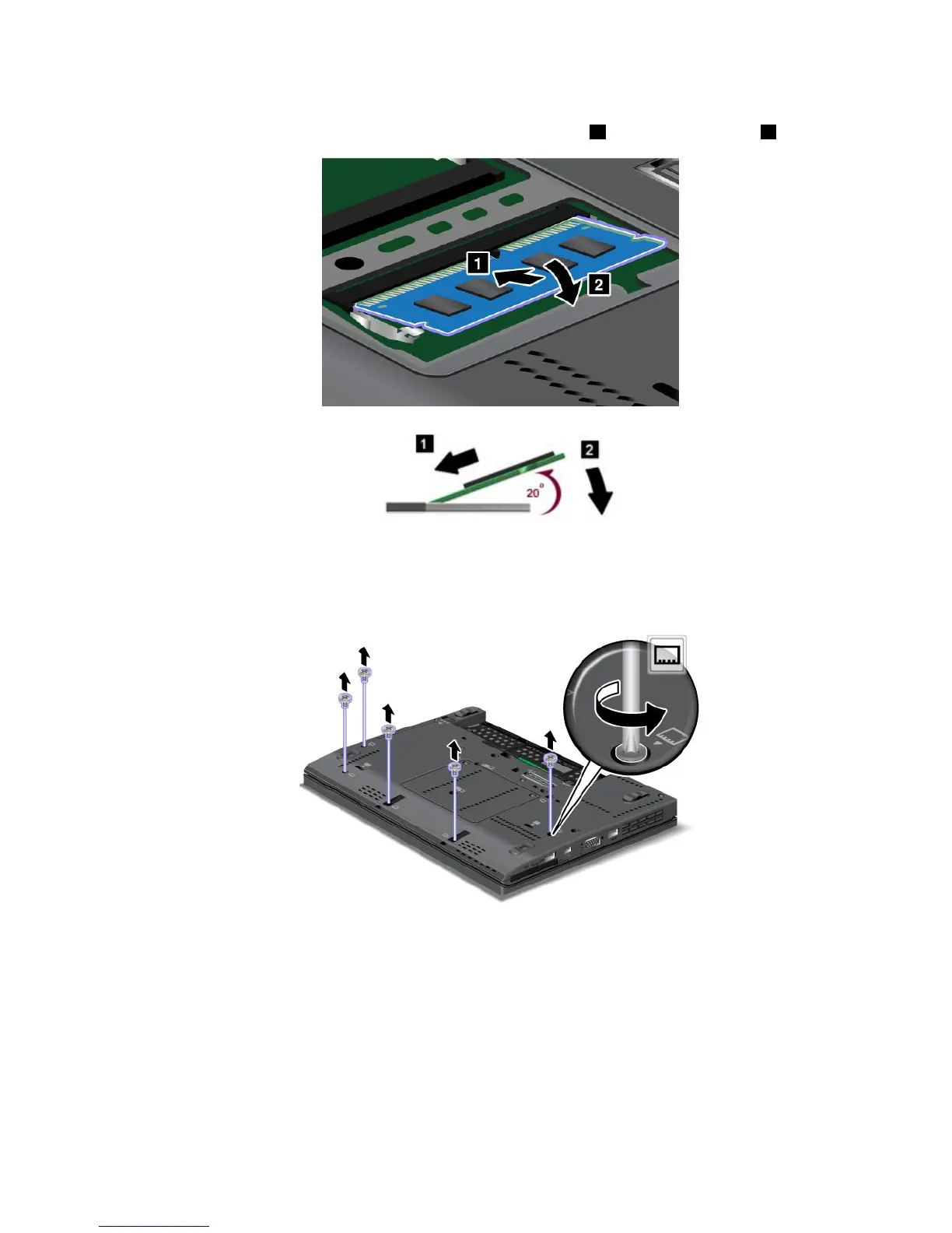 memorymoduleintothesocketatanangleofabout20degrees1;thenpressitinrmly2.