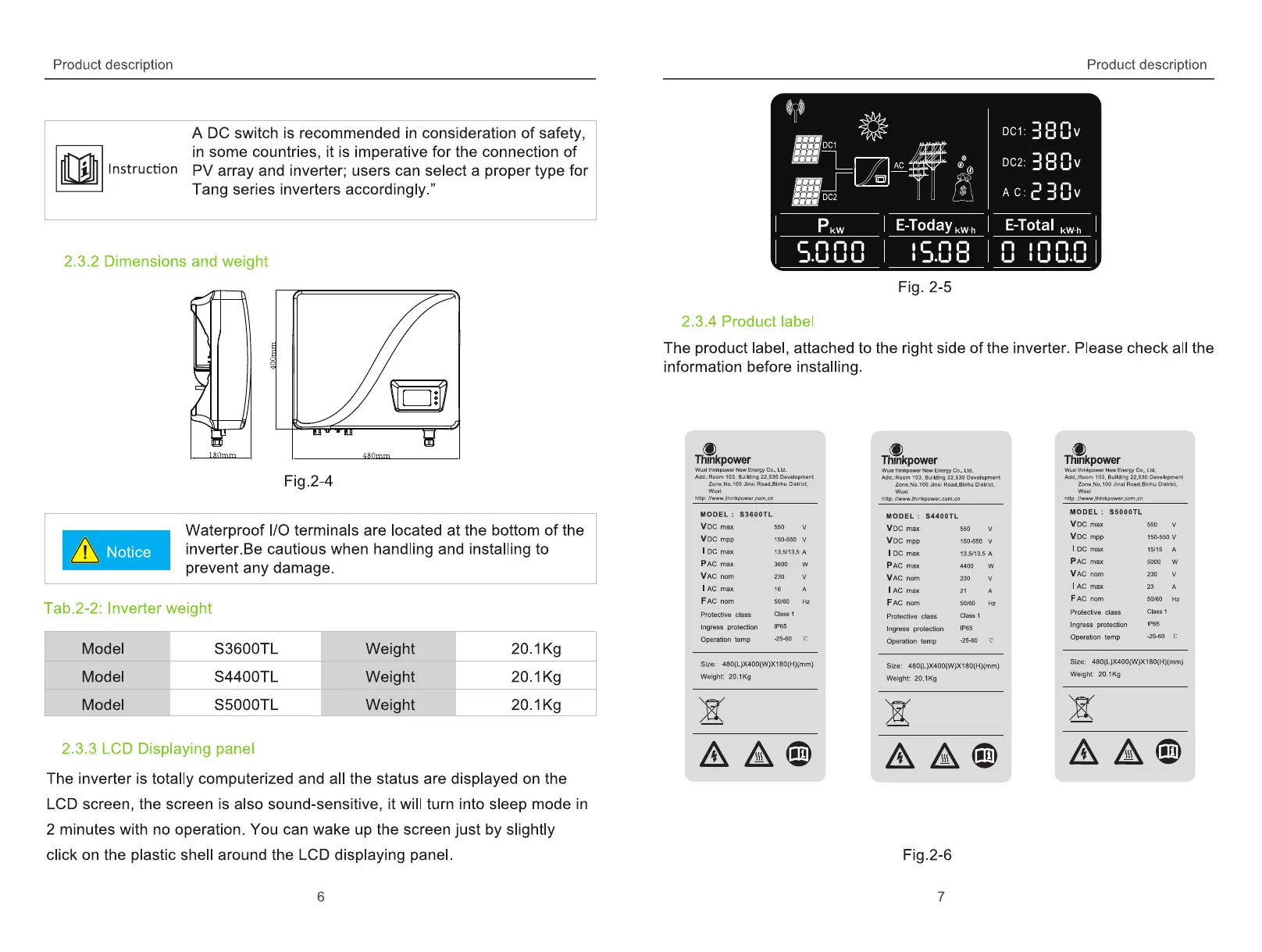 Thinkpower S3600TL - Dimensions and Weight; LCD Display Panel; Product Label Information