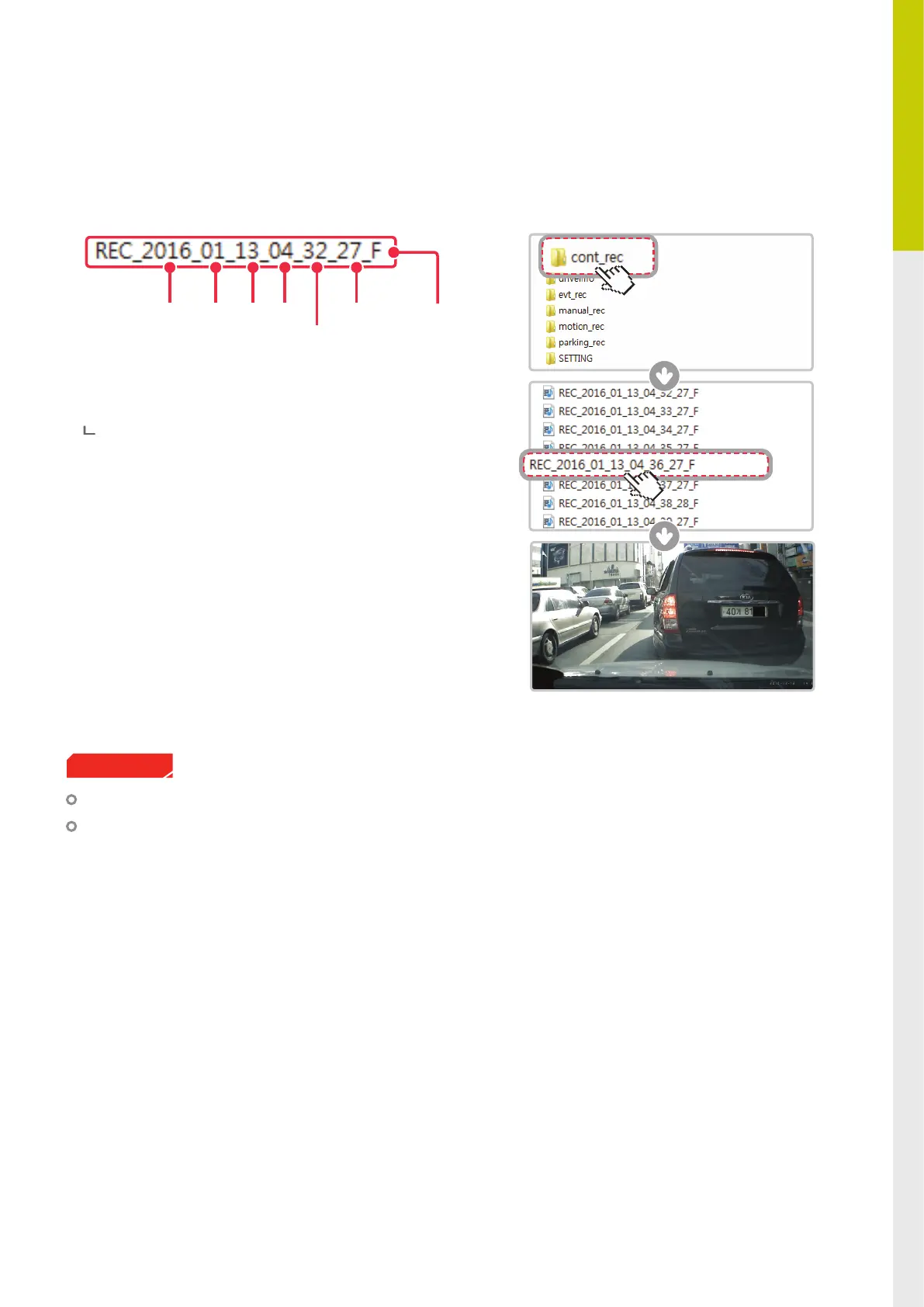 Recorded video les are saved in the folder by date and hour in the MicroSD card.