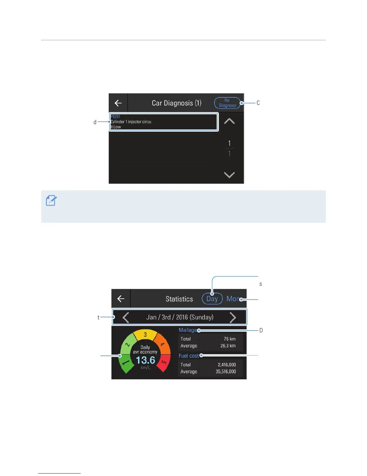 cost, the mileage, and daily or monthly statistics of fuel cost as follows.
