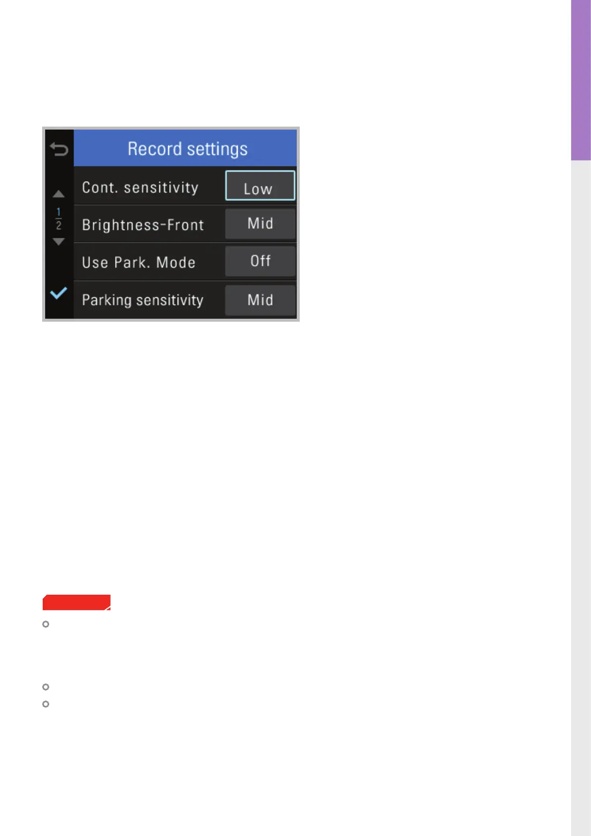 Parking Sensitivity : Sets the impact sensitivity during parking recording mode