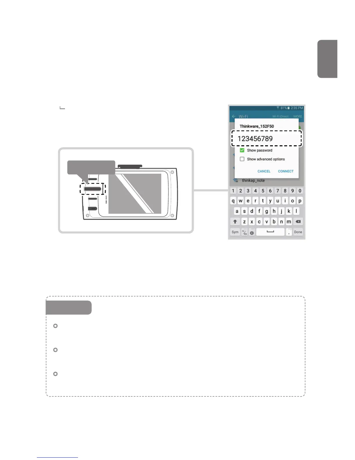 Wi-Fi option, select "thinkware" from SSID list, and enter password as