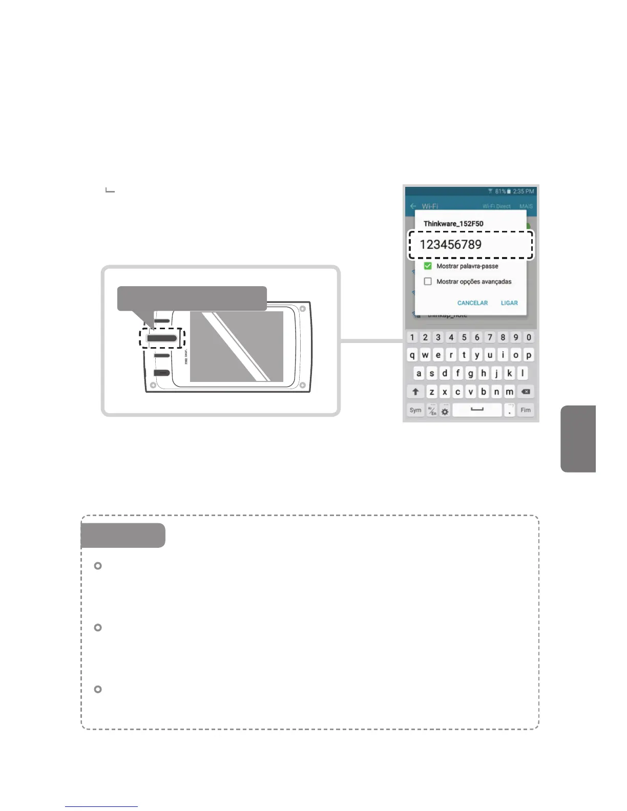 a opção Wi-Fi, selecione "thinkware" na lista SSID e insira a senha como