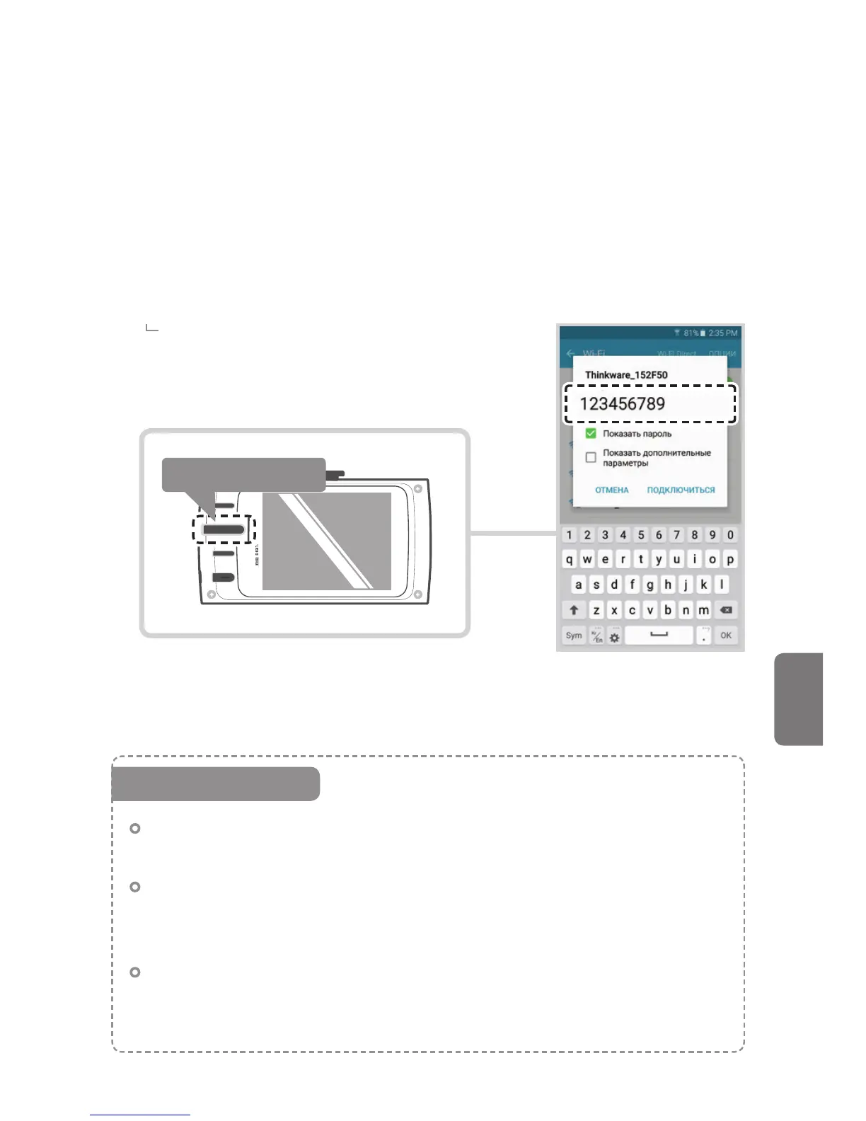 опцию Wi-Fi, выберите «thinkware» из списка SSID и введите пароль
