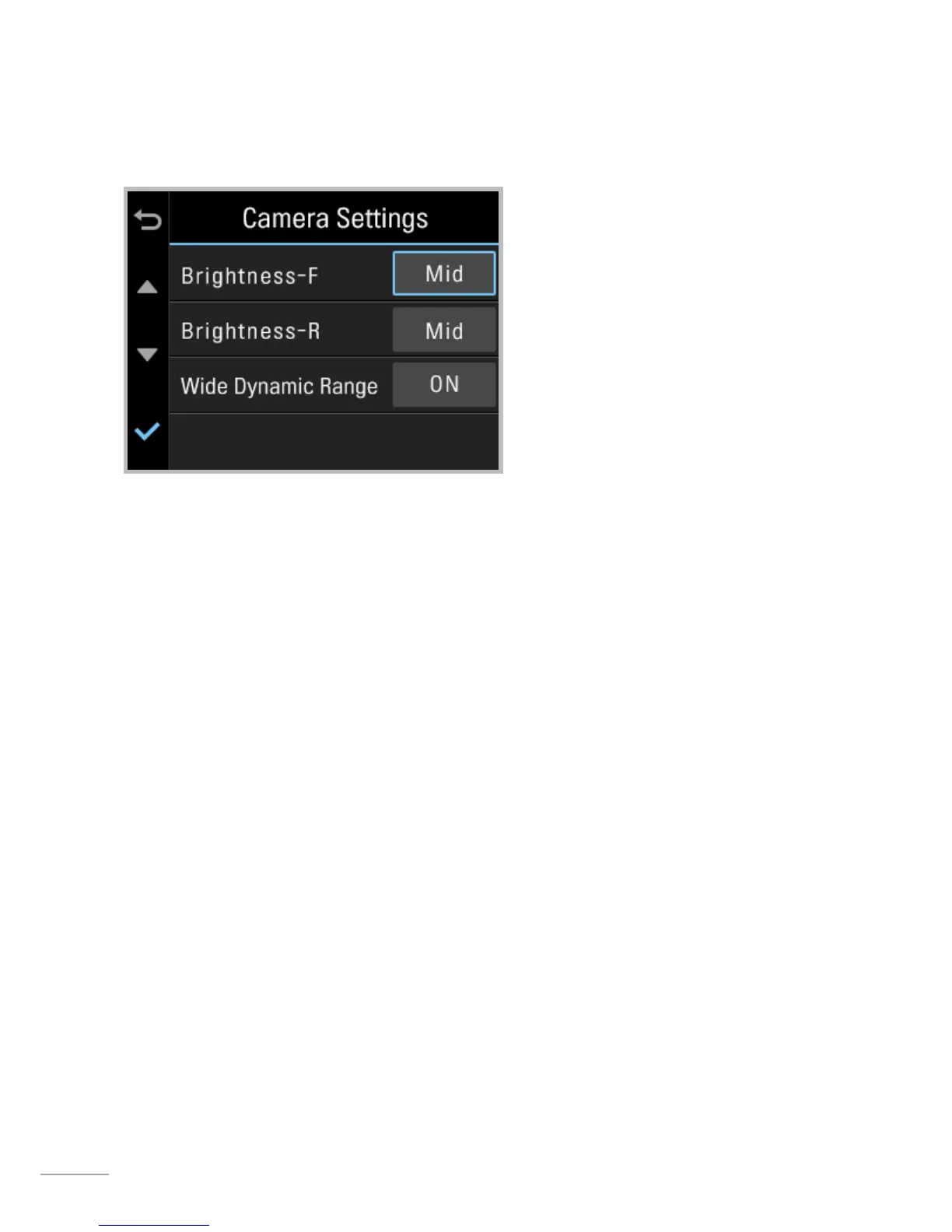 Brightness-F/R : Sets the video recording brightness for front/rear camera