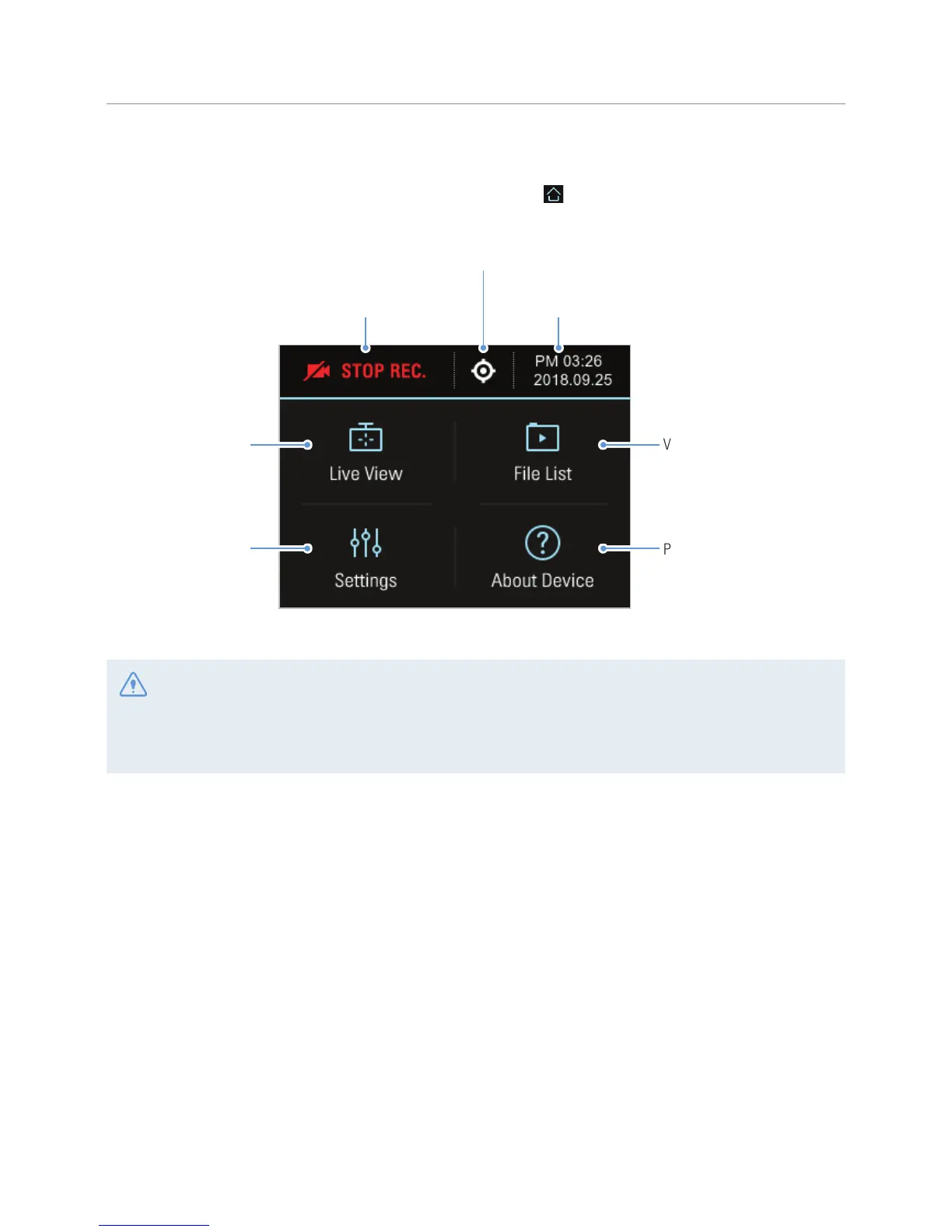 •While operating the Home screen, the product will stop recording.