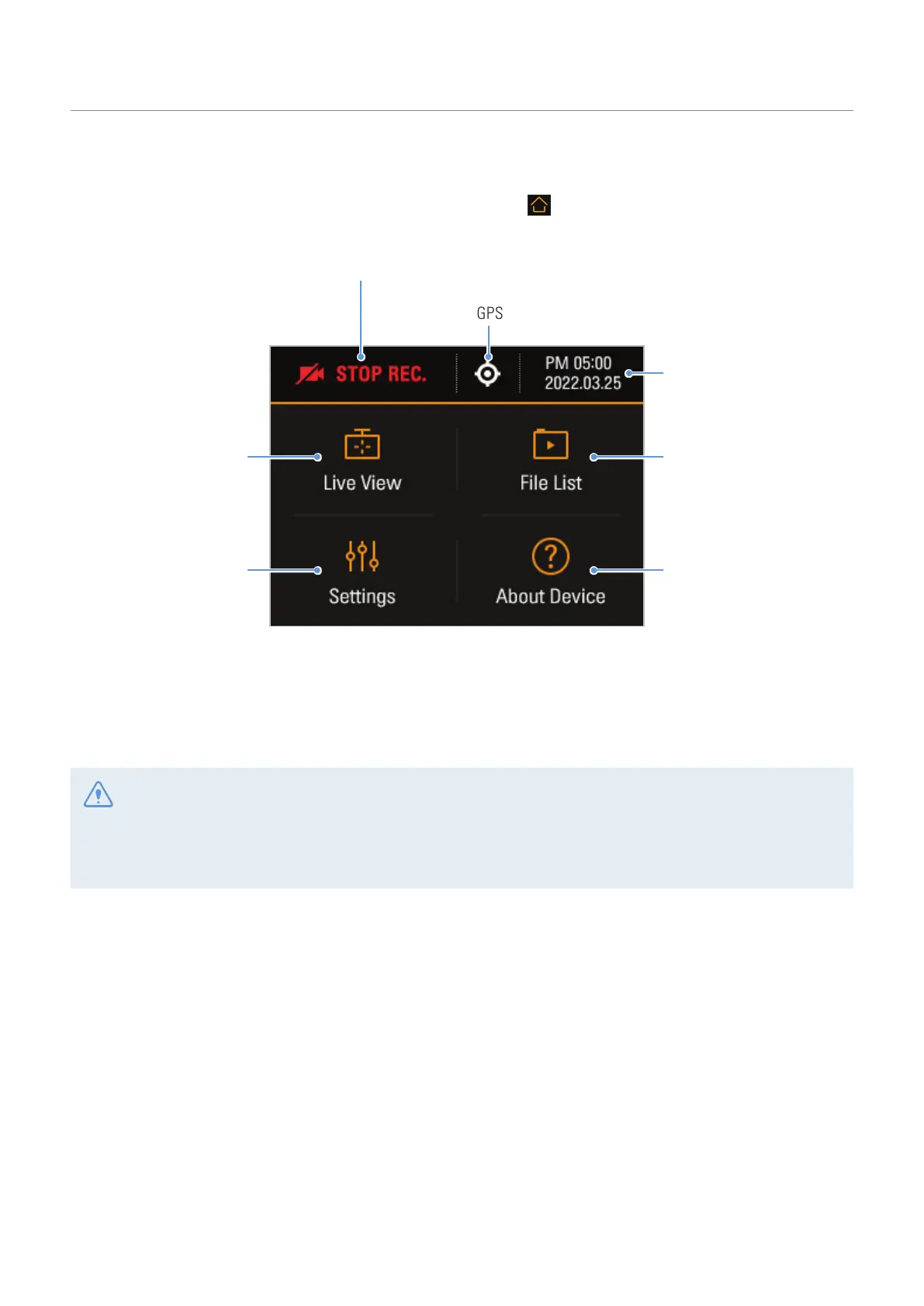 You can move to the Home screen by tapping the Home menu ( ) button on the Live view screen.