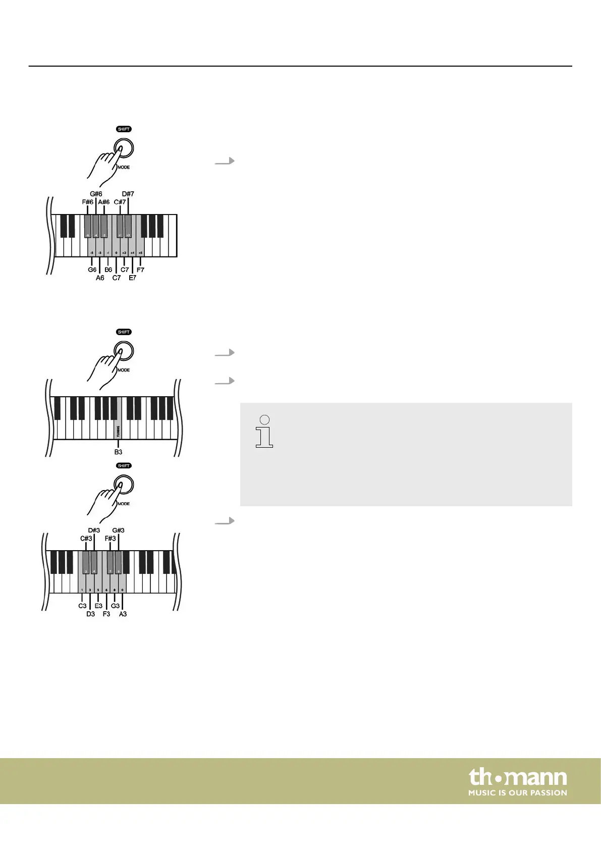1. Press and hold [SHIFT] and press the piano key [B3] to activate the tuning func‐