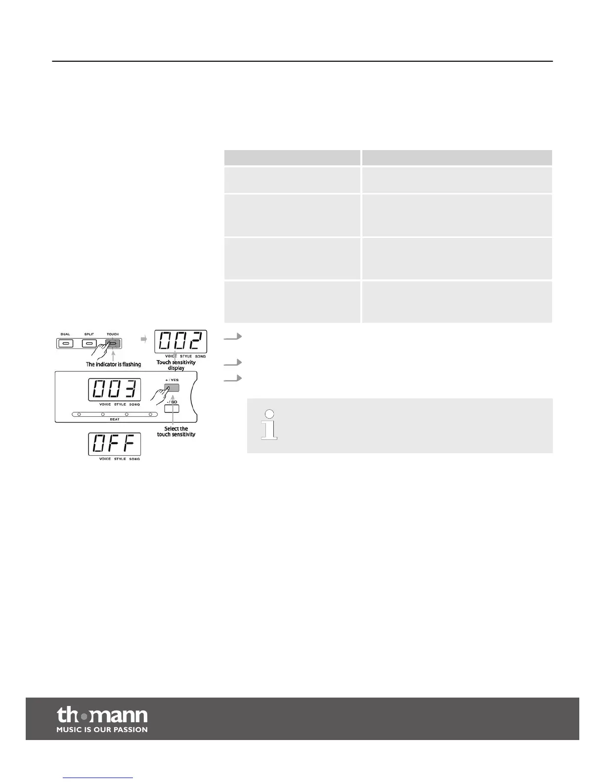 This function lets you adjust the touch response of the keyboard in four steps.