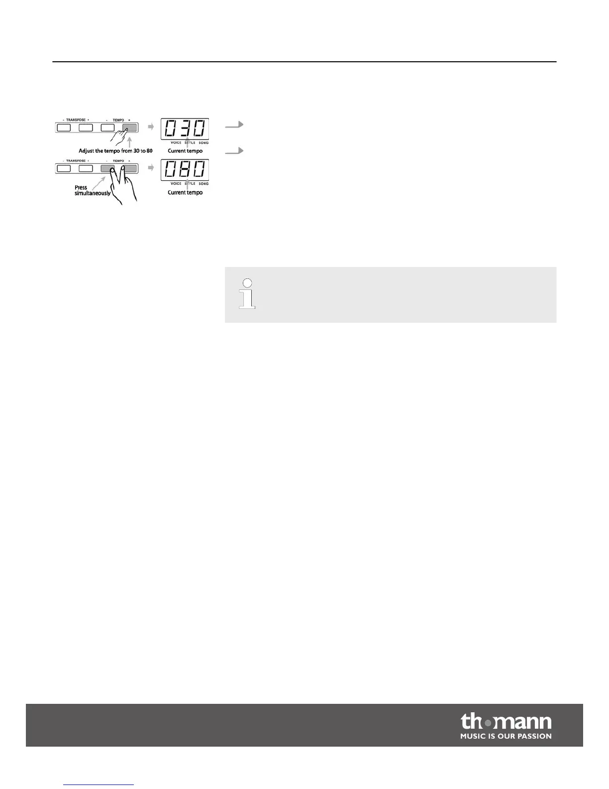 1. Press the buttons [TEMPO+]/[TEMPO–] to adjust the tempo within a range of 30