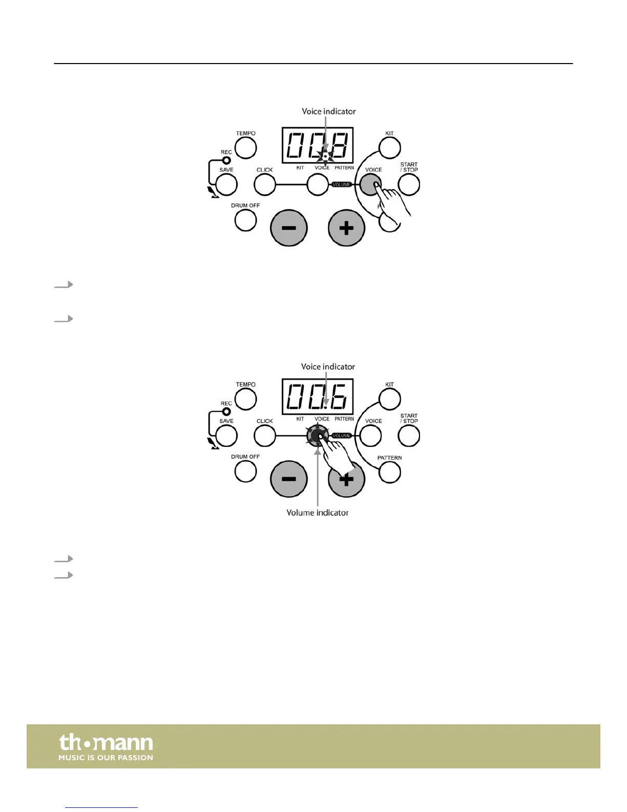 In voice selecting mode, press the [VOLUME] button to enter pad volume adjusting mode. Then the ‘VOLUME’ indicator lights up