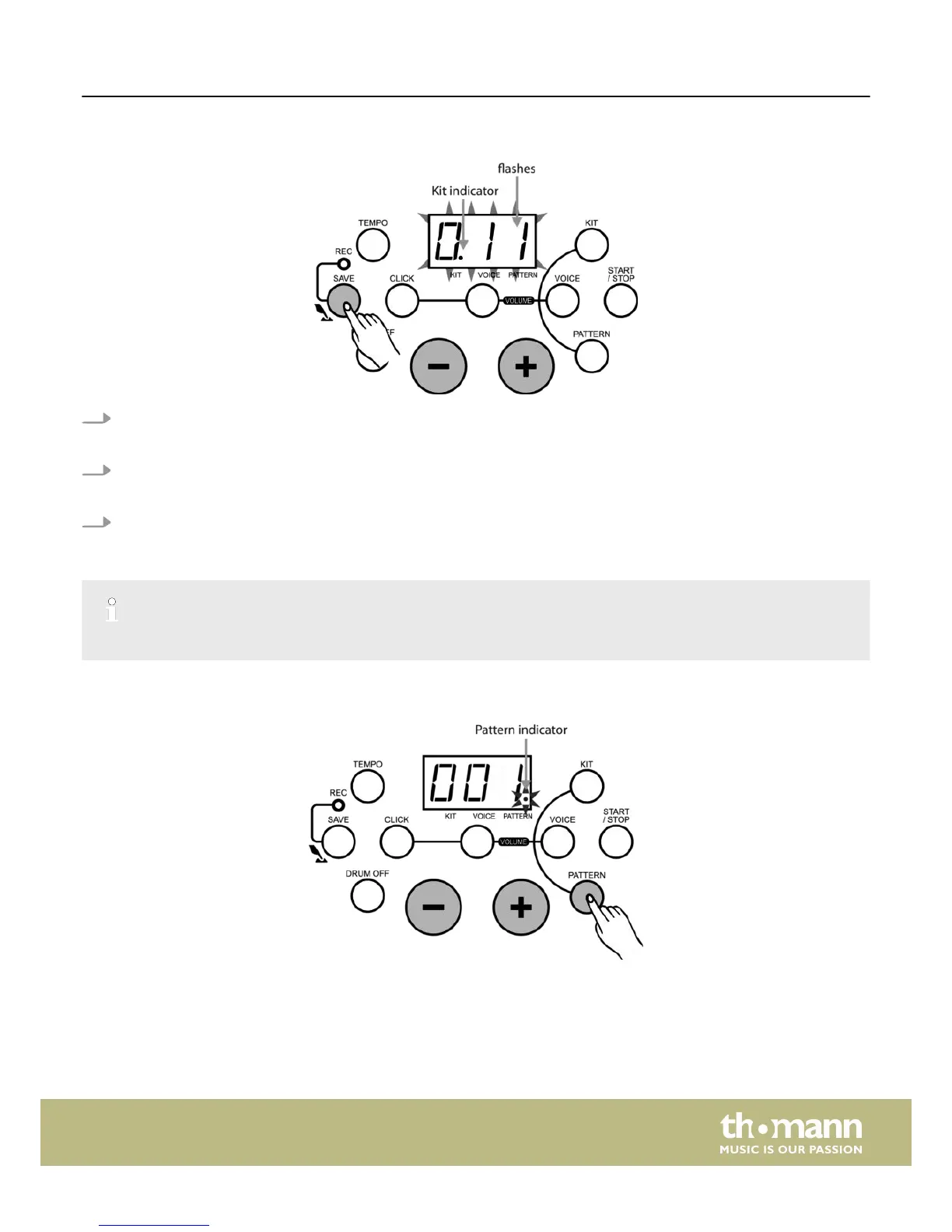 The LED display shows the user KIT number to save, the ‘KIT’ indicator lights up and the user KIT number flashes.