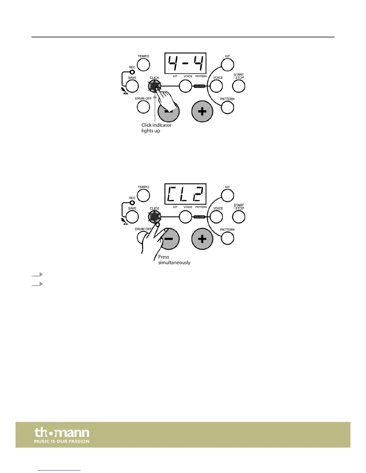 2. Then press the [+/–] buttons to select the desired metronome sound, i.e. the ‘click’.