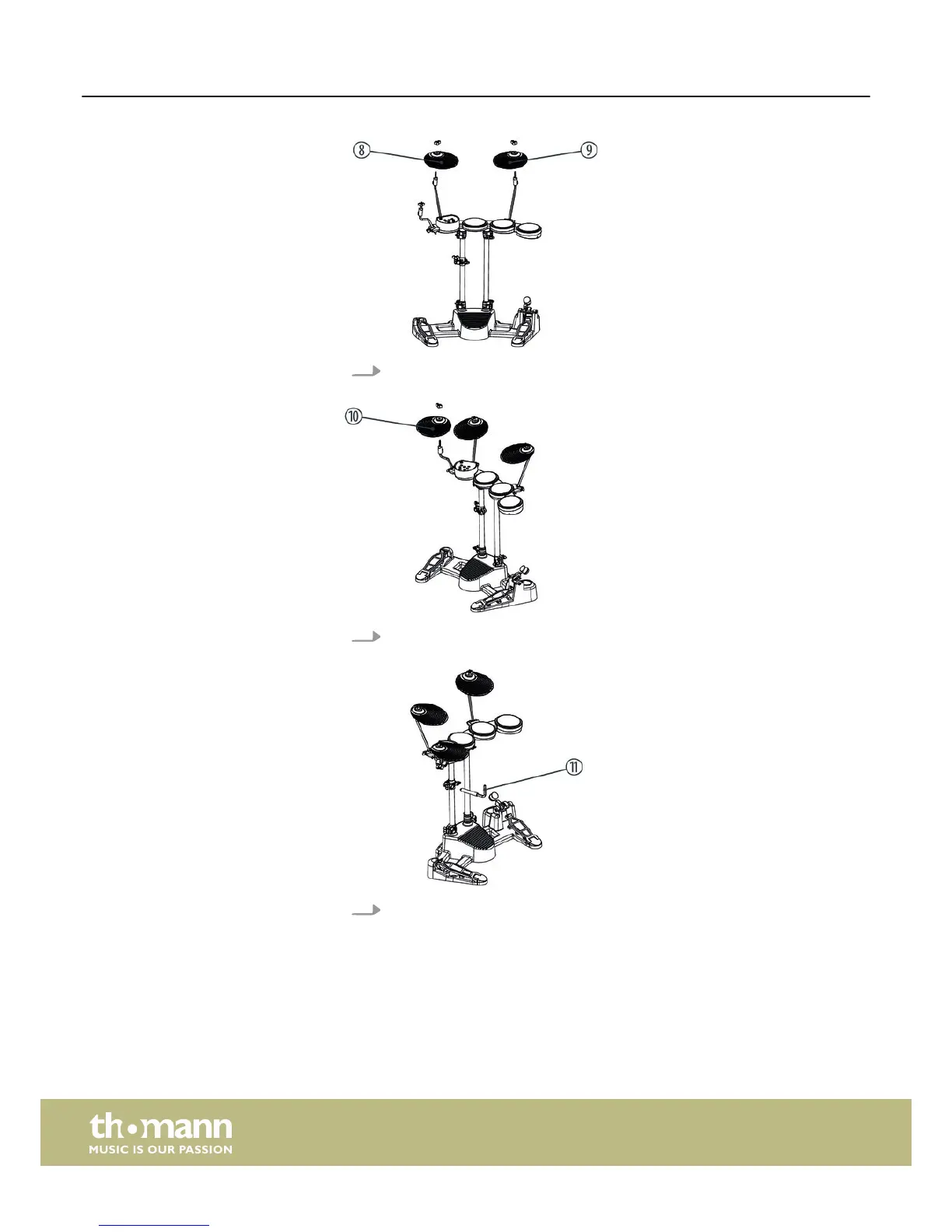 4. Place the two ride and crash cymbals (8) and (9) onto the cymbal holders (5)