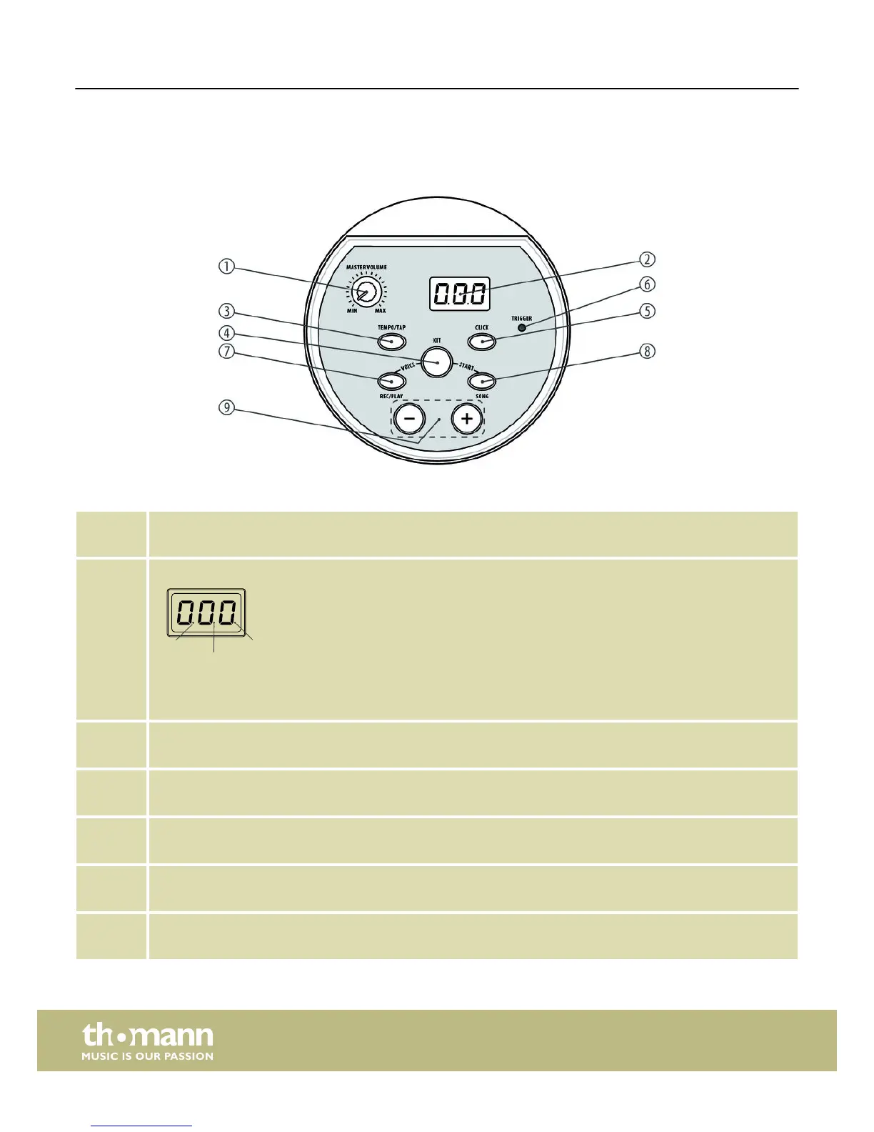Displays the Song, Kit and Pad numbers and various setting parameters. In the SONG mode, the song number