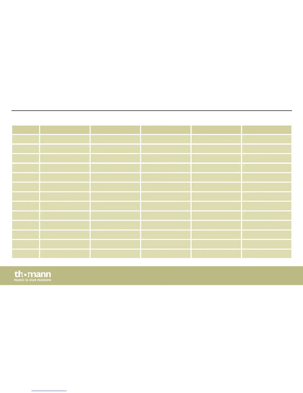Note Standard 1 (bank 0) Standard 2 (bank 4) Room (bank 8 ) Rock (bank 16 ) Funk (bank 17 )