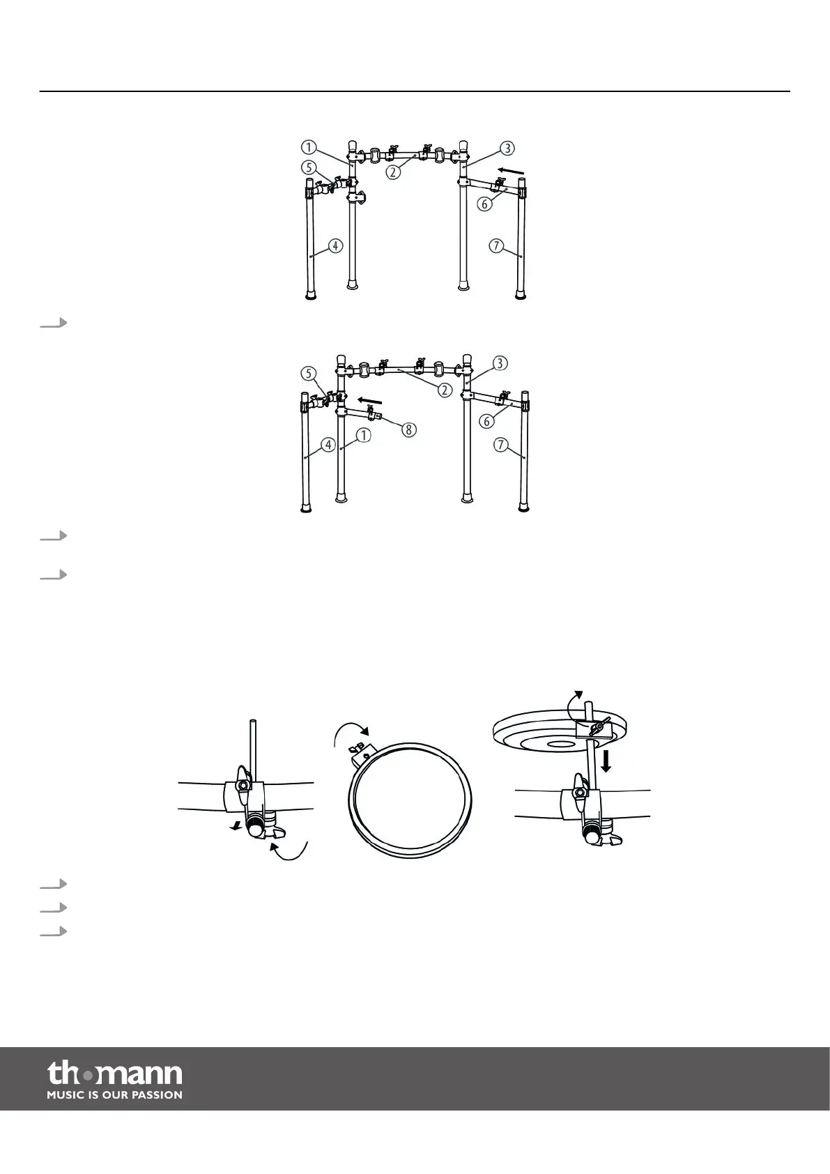 5. Connect the right side arm (pre-mounted pipes 6 and 7) to the lower terminal of pipe (3) and tighten the screws of the