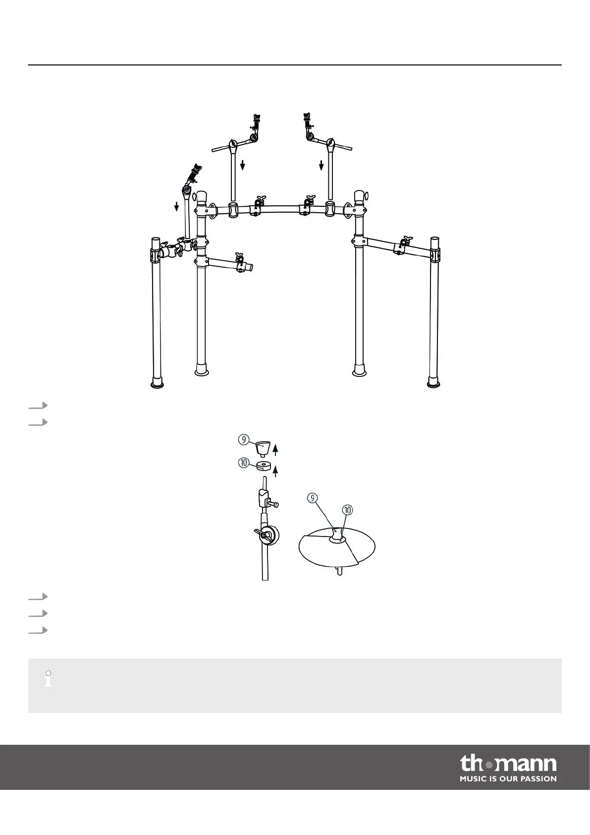 5. Then place the felt washers (10) on the cymbals and fix the cymbals with the associated wing nuts (9) on the holders.