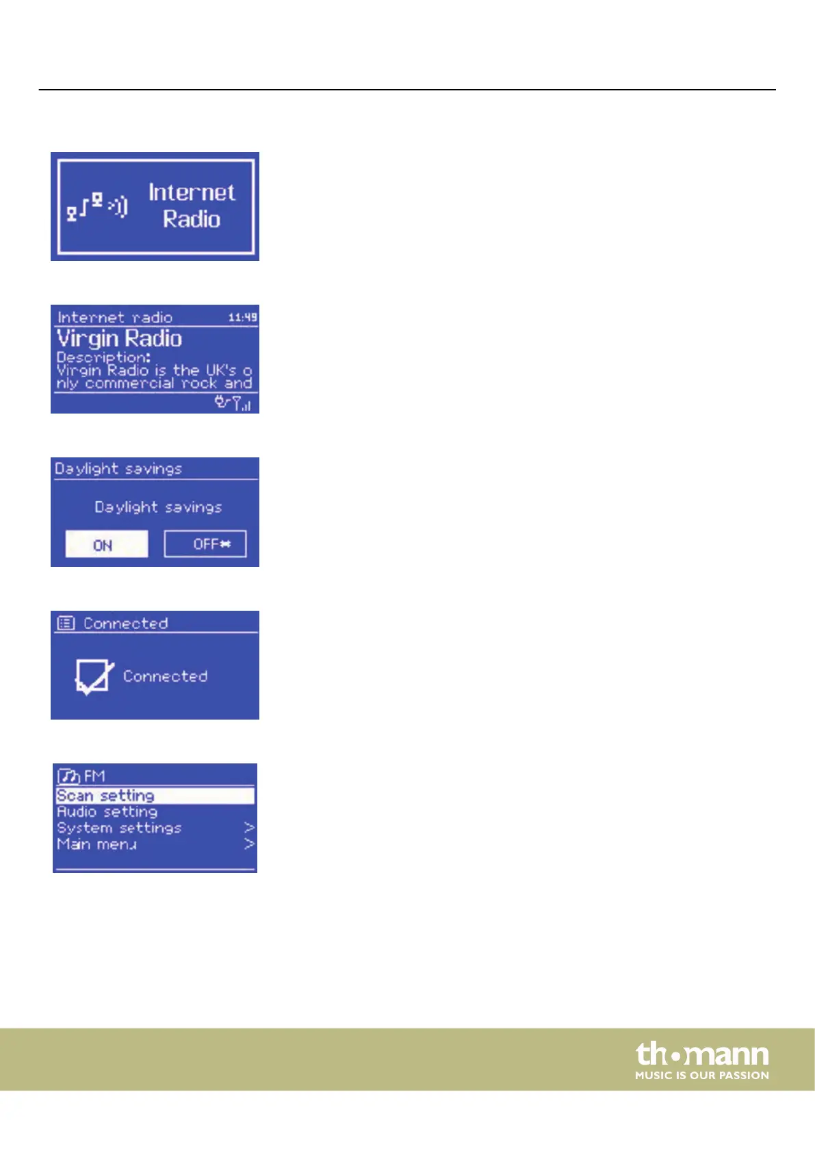 In each mode, a start screen is displayed after it is called up. The last radio station or