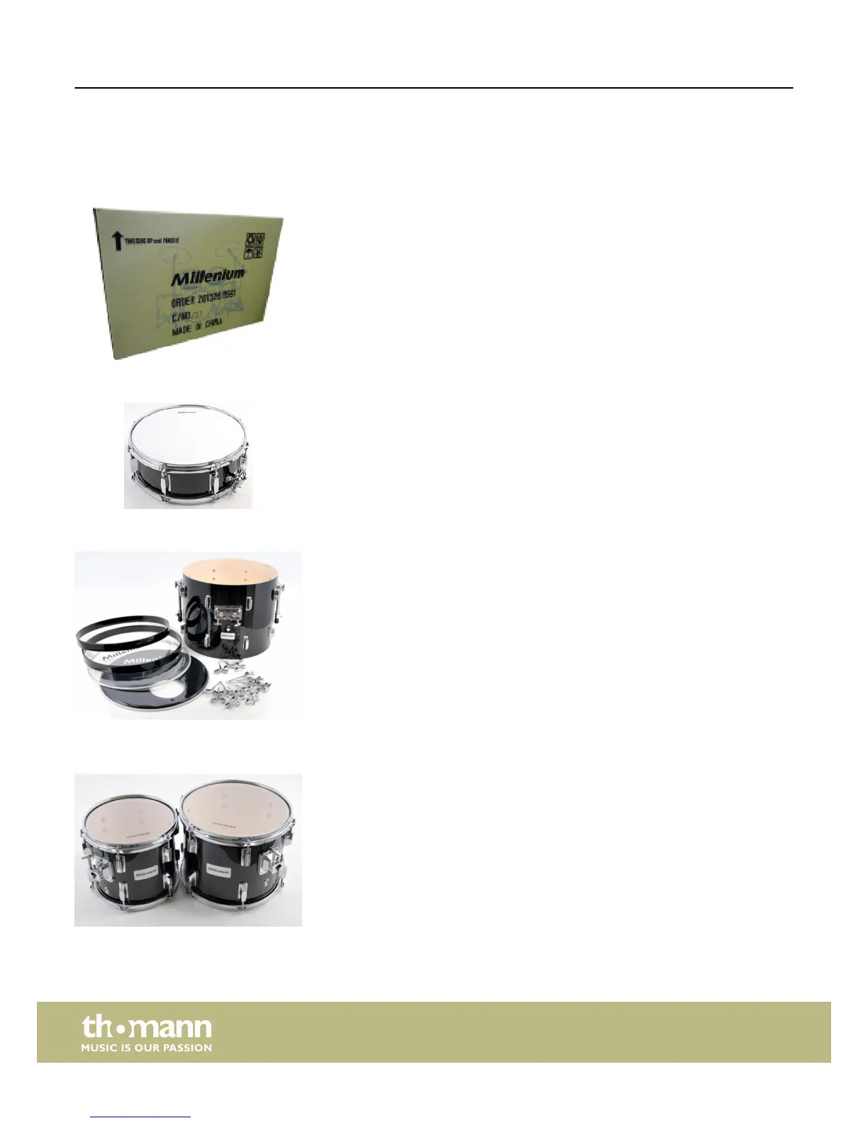 The complete drum set is supplied in one cardboard box. It is supplied dismantled in