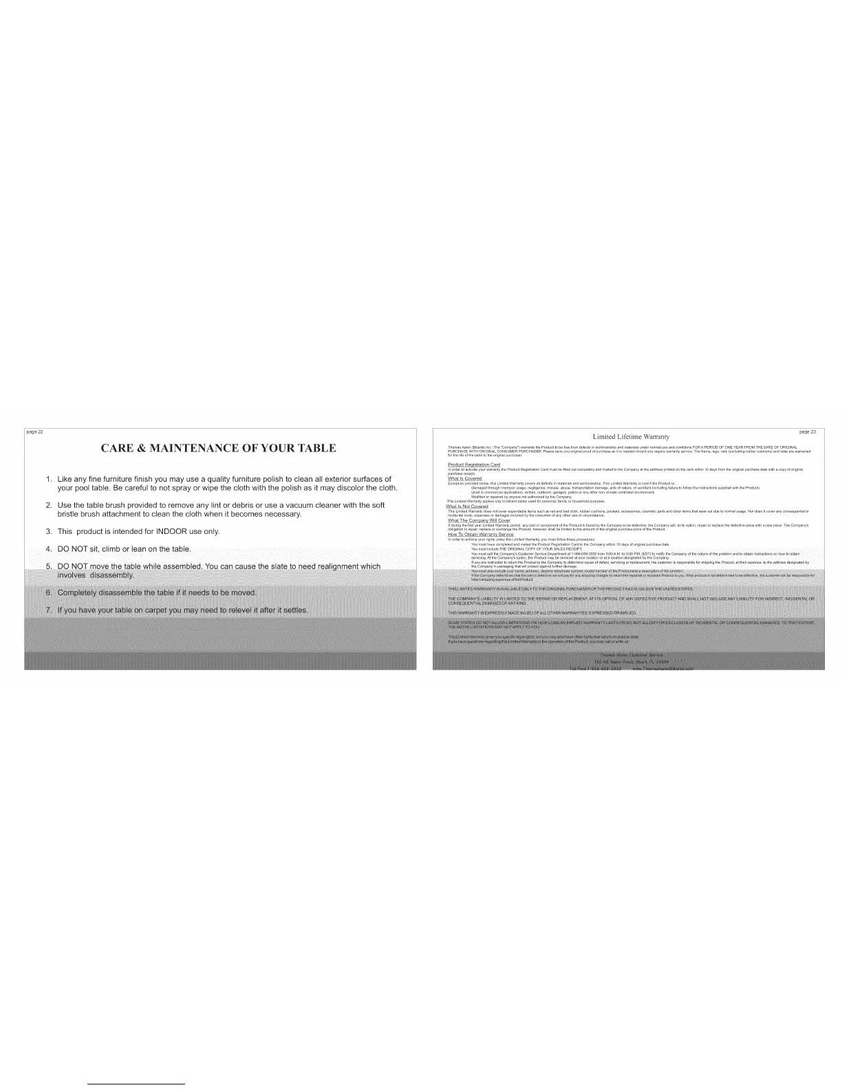 Thomas Aaron Billiards Inc. (The "Company") warrants the Product to be free from defects in workmanship and matedals under normal use and conditions FOR A PERIOD OF ONE YEAR FROM THE DATE OF ORIGINAL