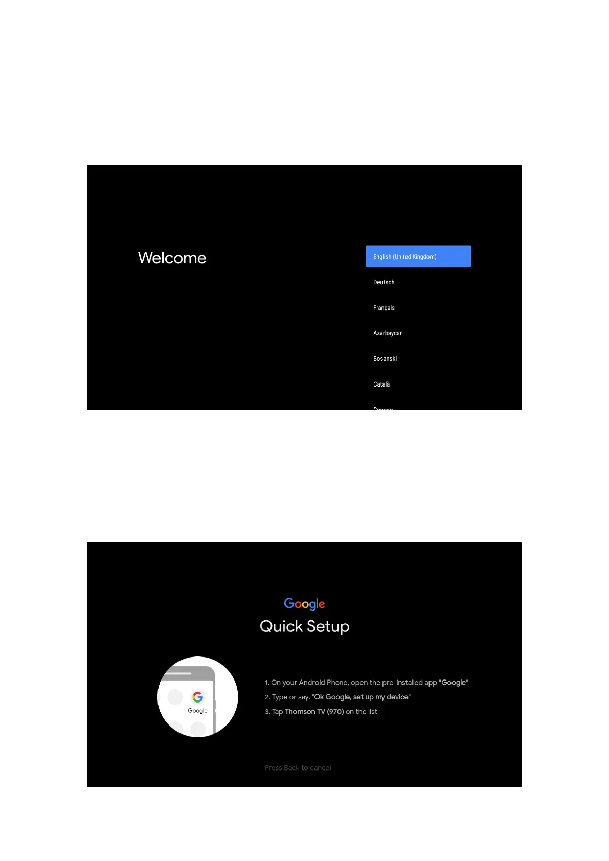 For the rst initial setup, in-screen setup wizard will guide you through setting up your TV. Please follow the
