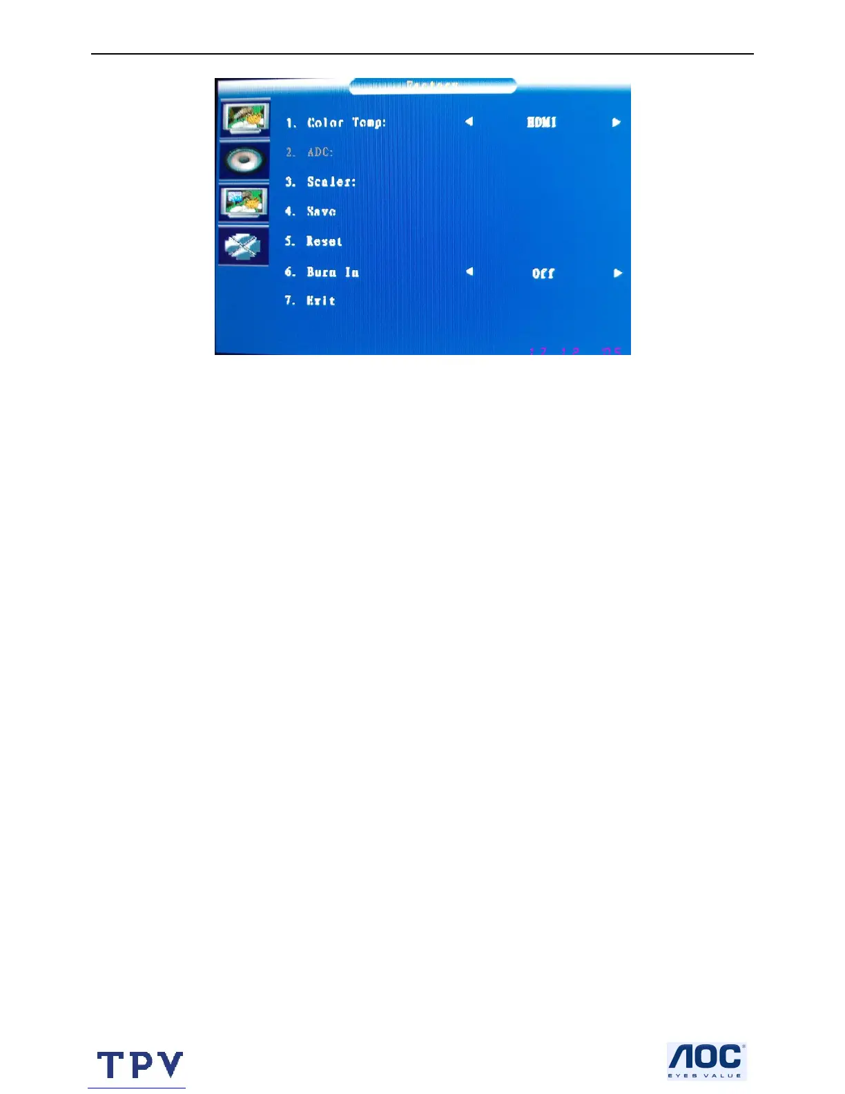 4.CHECK CUT OFF: Change the input signal to 0% white level performance. Firstly, press the “brightness” from