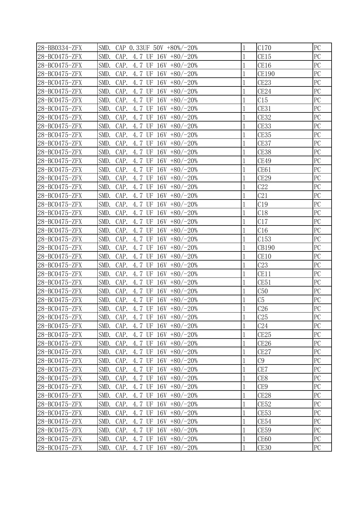 28-BC0475-ZFX SMD. CAP. 4.7 UF 16V +80/-20% 1 CE29 PC
