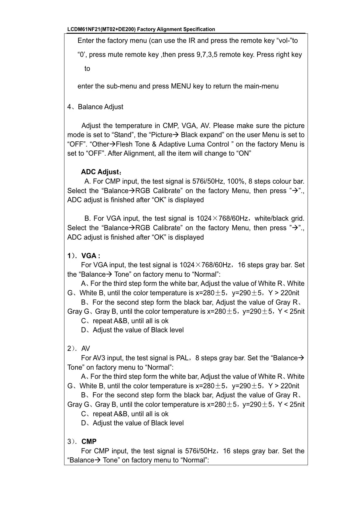 LCDM61NF21(MT02+DE200) Factory Alignment Specification
