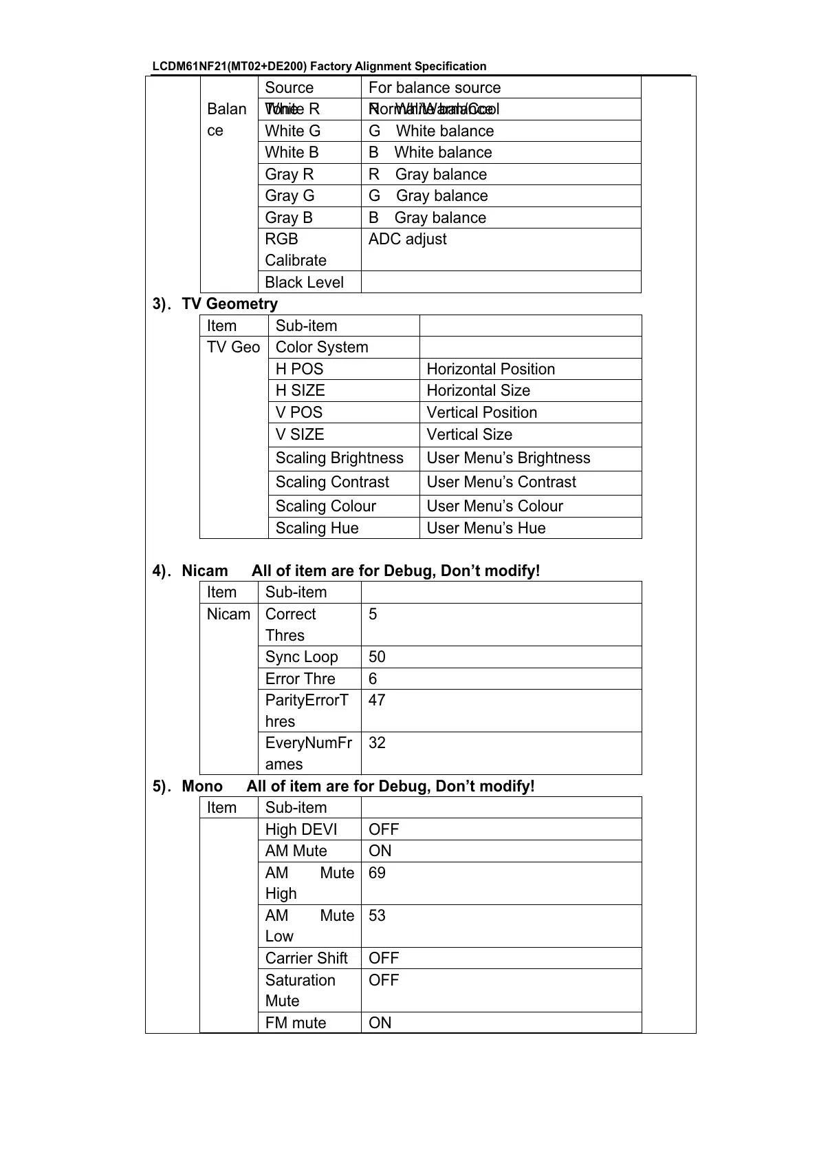 LCDM61NF21(MT02+DE200) Factory Alignment Specification