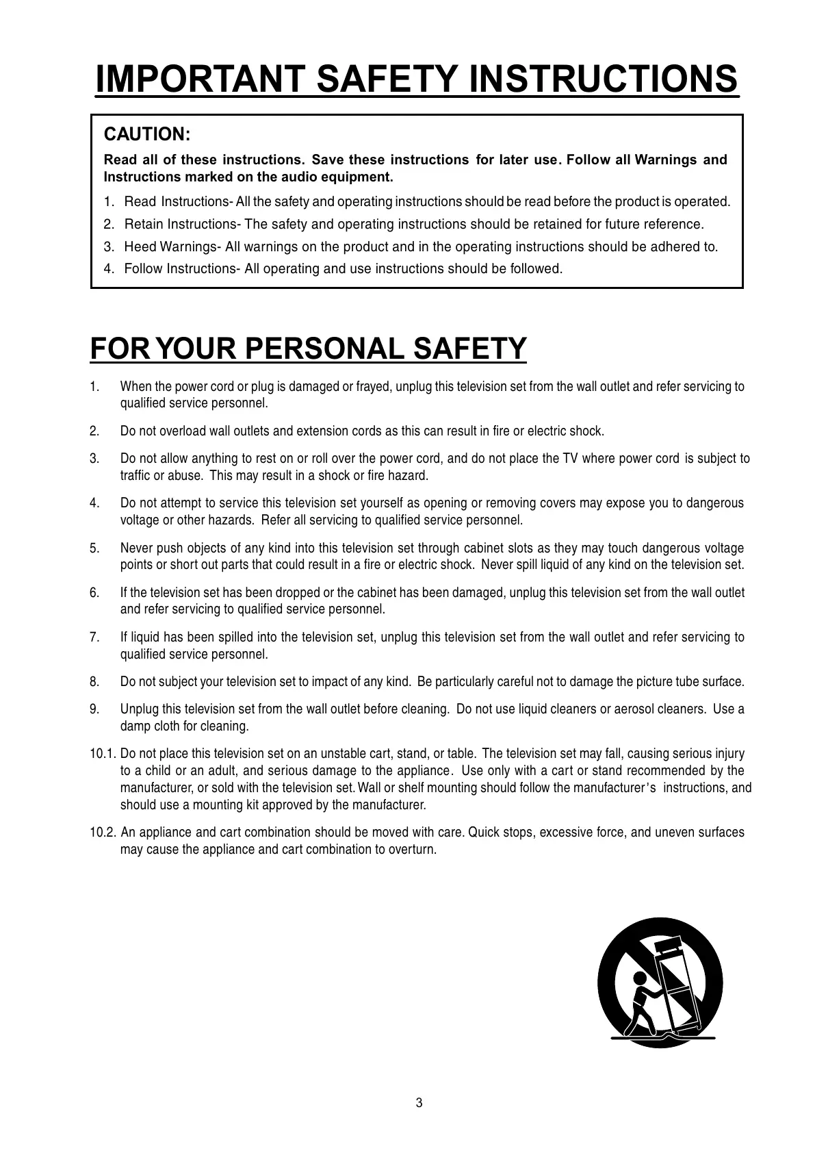 5. Never push objects of any kind into this television set through cabinet slots as they may touch dangerous voltage