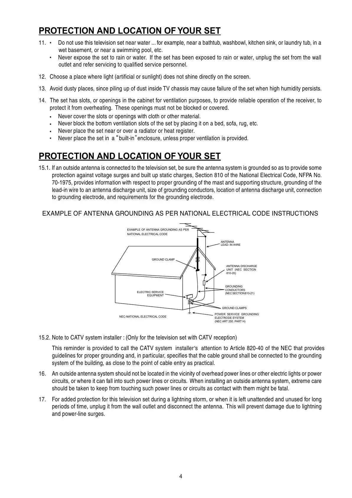 15.1. If an outside antenna is connected to the television set, be sure the antenna system is grounded so as to provide some