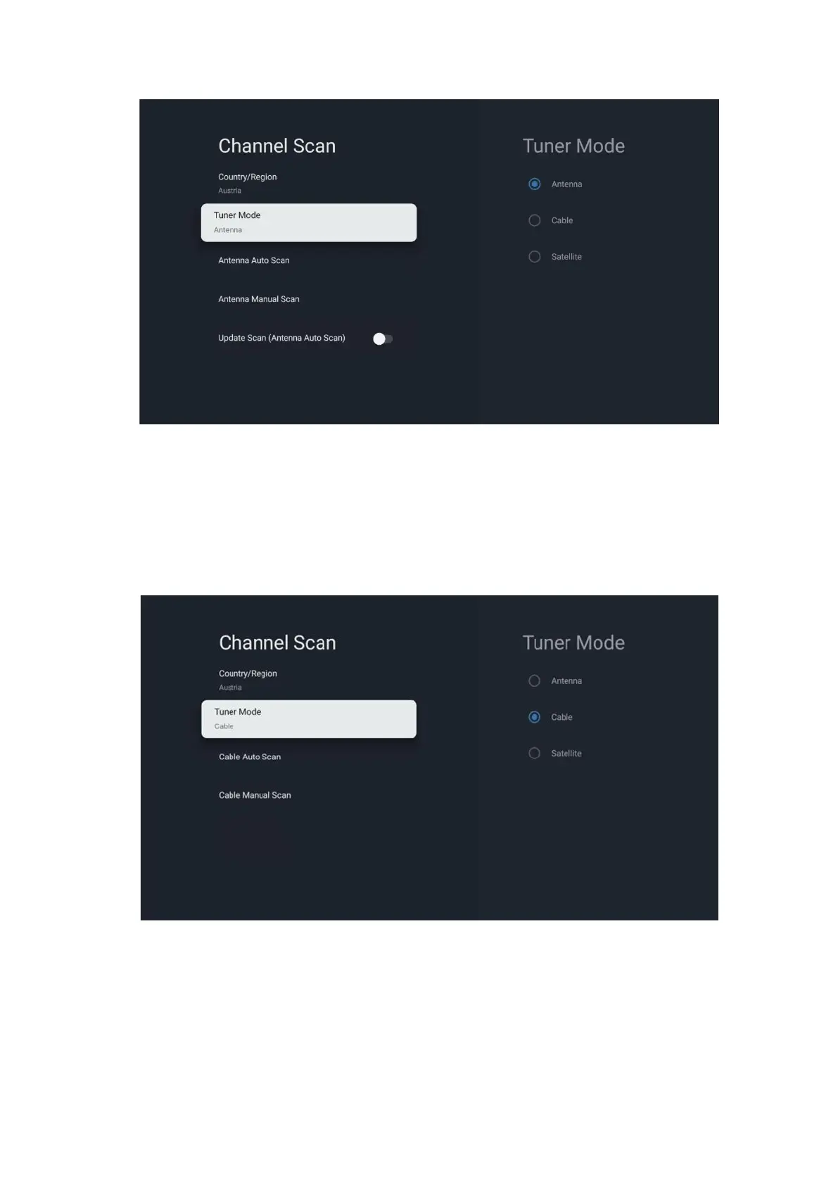 Select the Cable Auto Scan or Cable Manual Scan submenu and press OK. Enter your PIN code