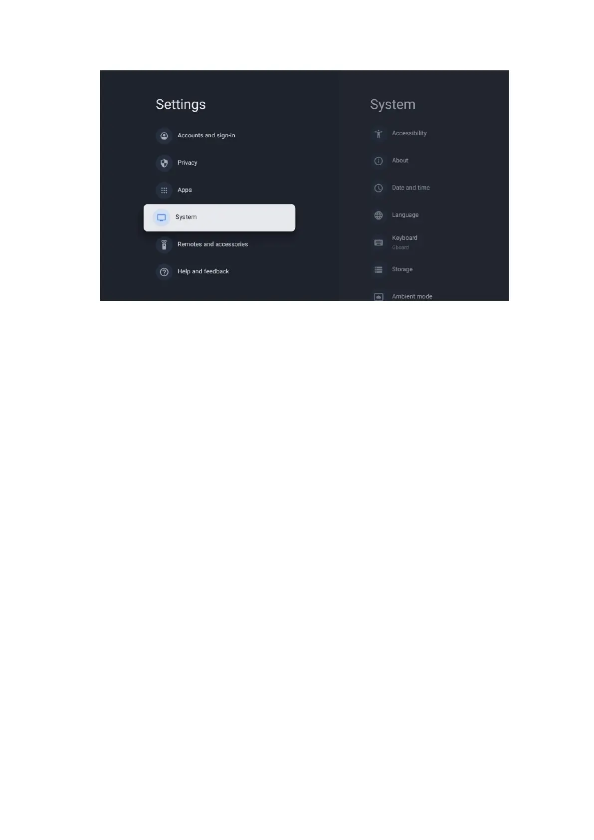 Here you can find hardware and software information about your TV as well as the Android OS