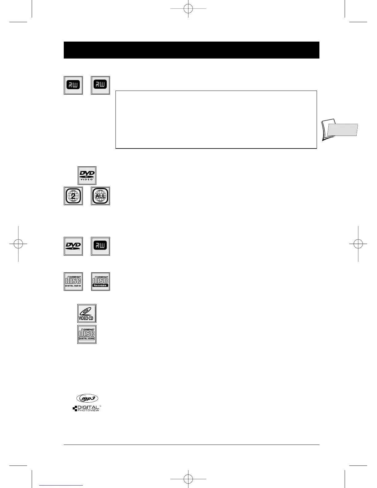 and DVD-RW and DVD+RW discs (rewritable). Recordings on DVD-R and