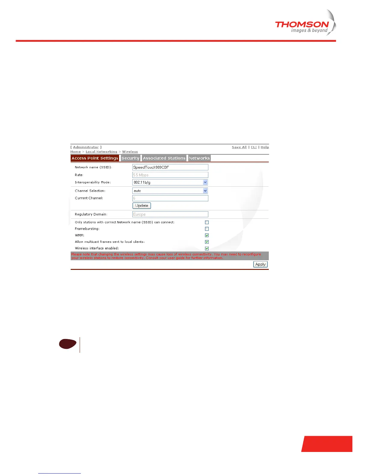 Be aware that in case you are connected wirelessly to the Thomson Gateway and you change its