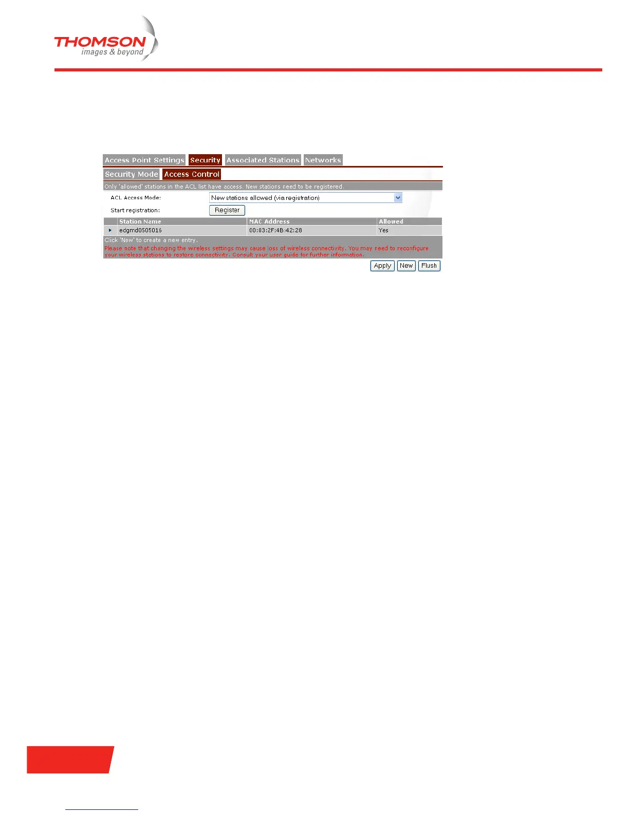 will be allowed to send/receive data via the Thomson Gateway AP. In case New wireless client allowed is not