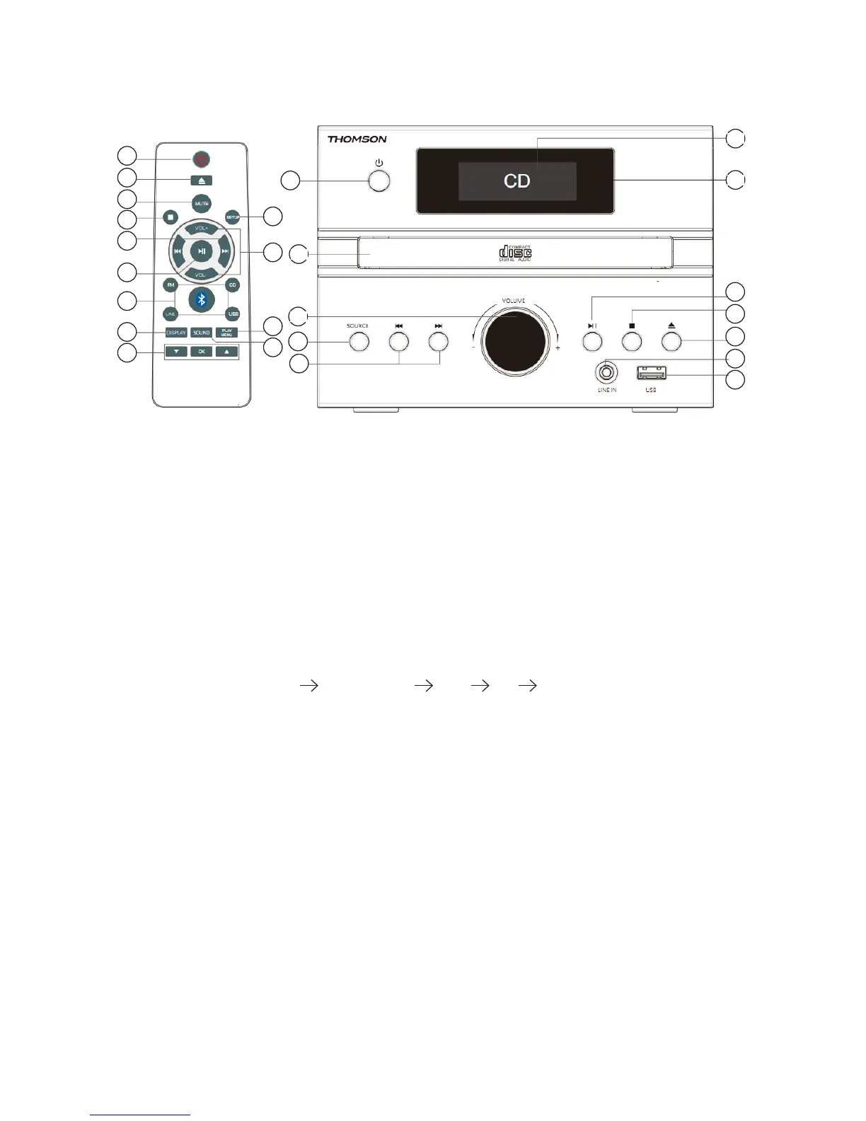 Op de hoofdeenheid: CD BLUETOOTH USB FM LINE IN