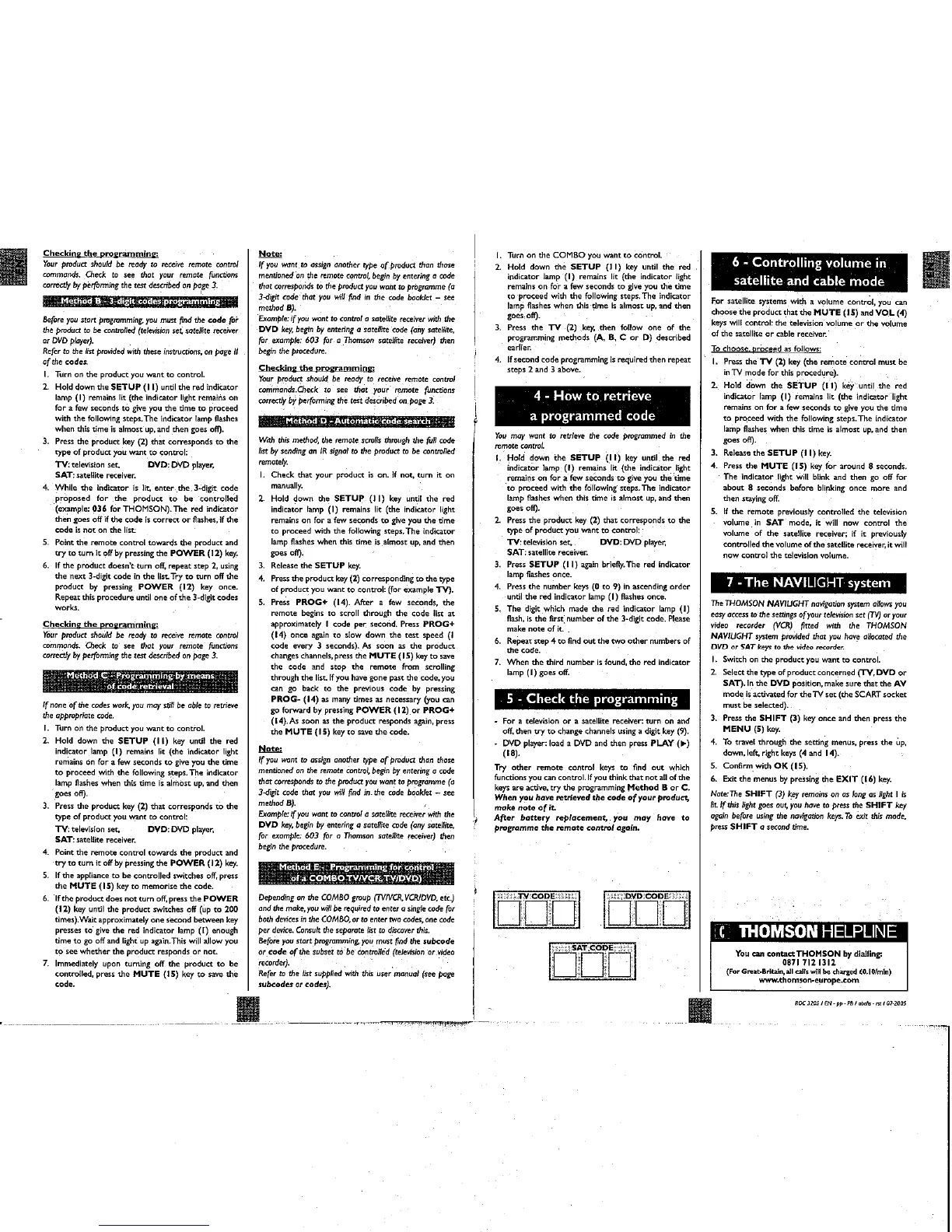 THOMSON ROC 3205 - Method B: 3-Digit Codes Programming; Method C: Code Retrieval Programming; Method D: Automatic Code Search; Method E: COMBO Device Programming
