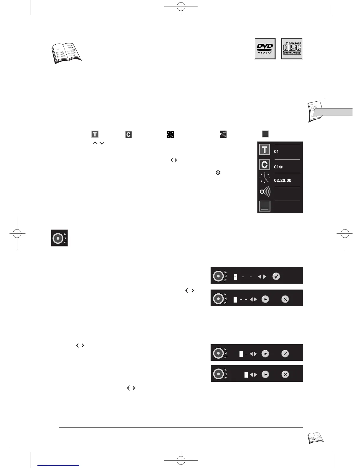 3 Select “ ” (title), “ ” (chapter), “ ” (elapsed time),“ ” (audio) or “ ” (Subtitles)