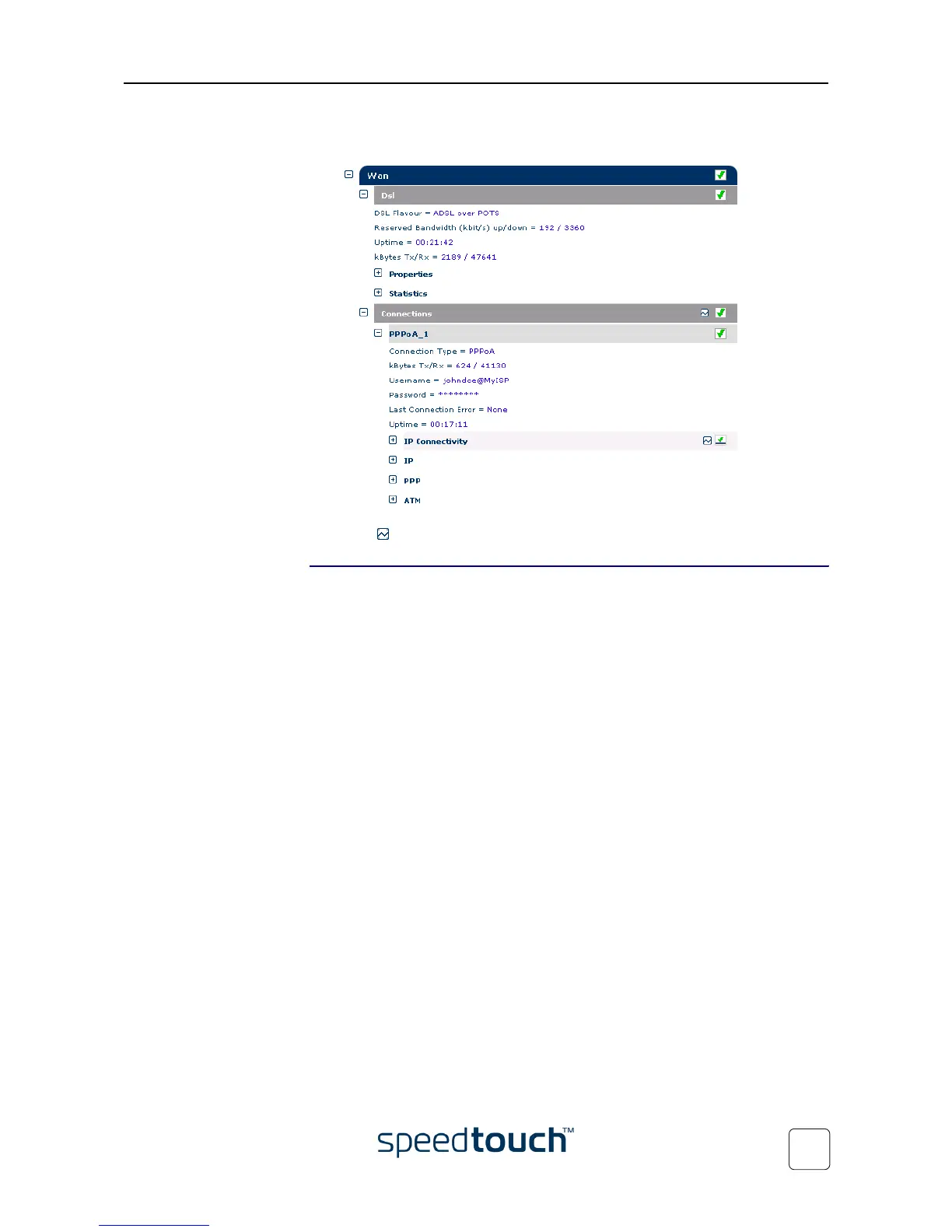 • Expand subsequently the Wan, DSL and Connections sections to view the current