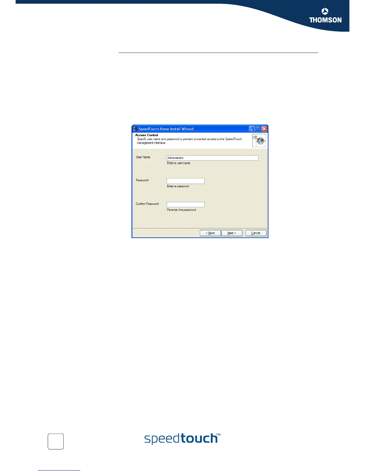 2 Provide a user name and password to protect your SpeedTouch™ from