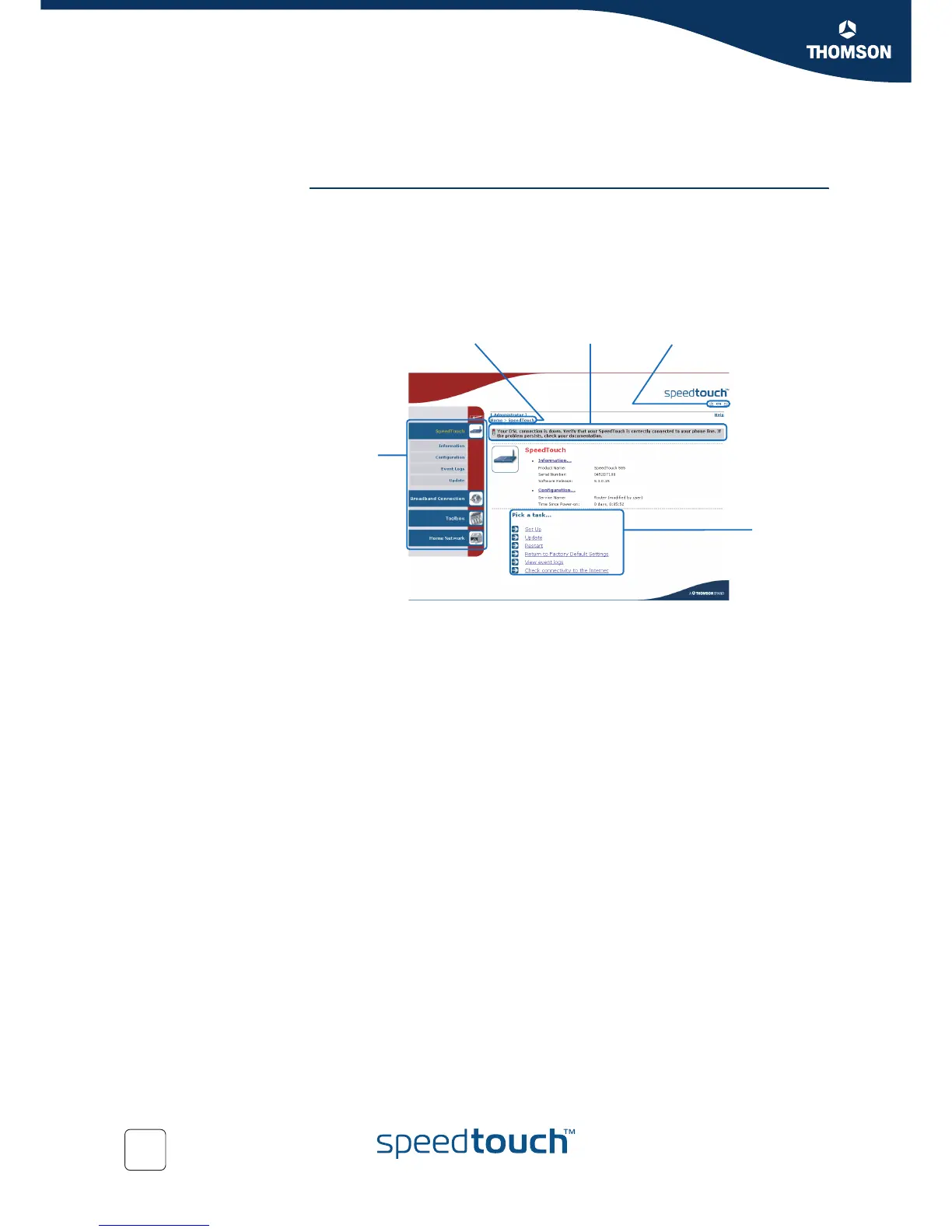 Navigation components The SpeedTouch™ Web interface consists of the following components: