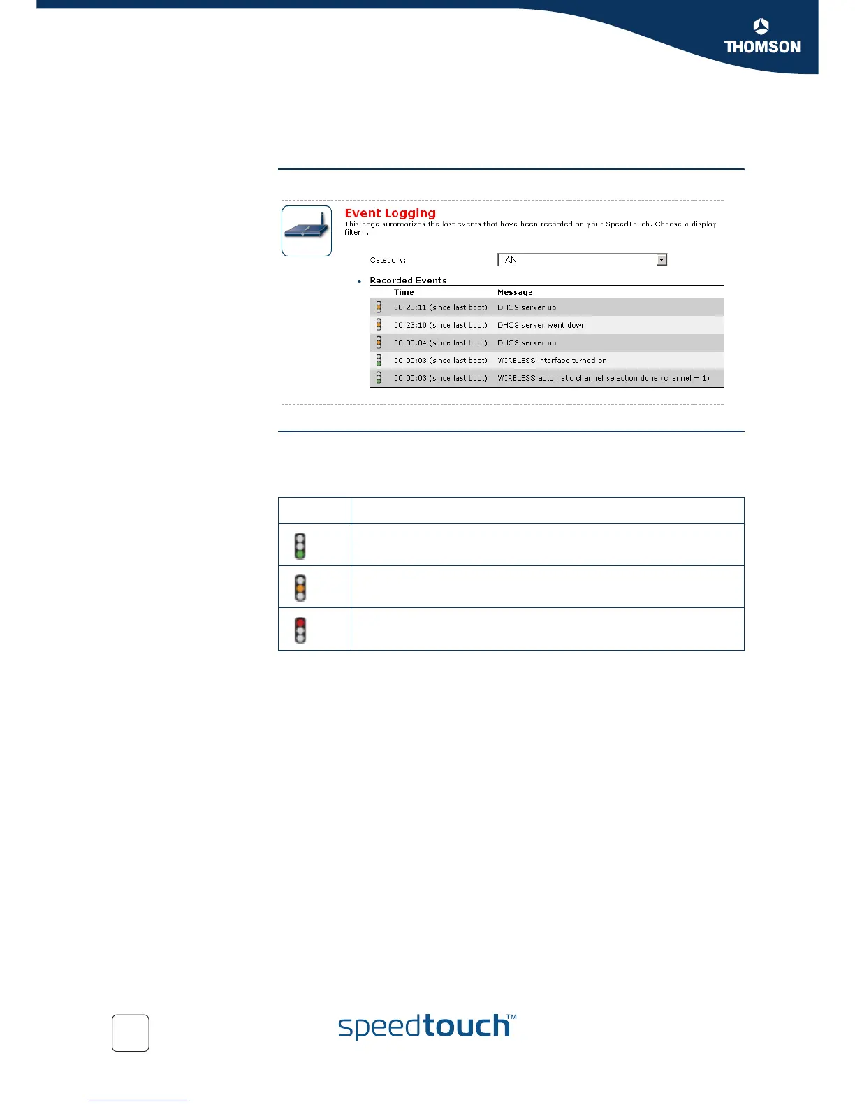 Event Logging The Event Logs page summarizes the latest events recorded on your SpeedTouch™.