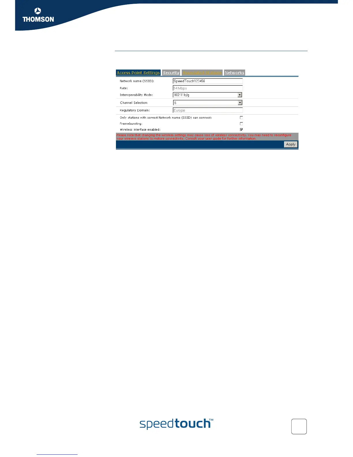 Cleared, the SpeedTouch™ broadcasts its SSID and accepts every client.