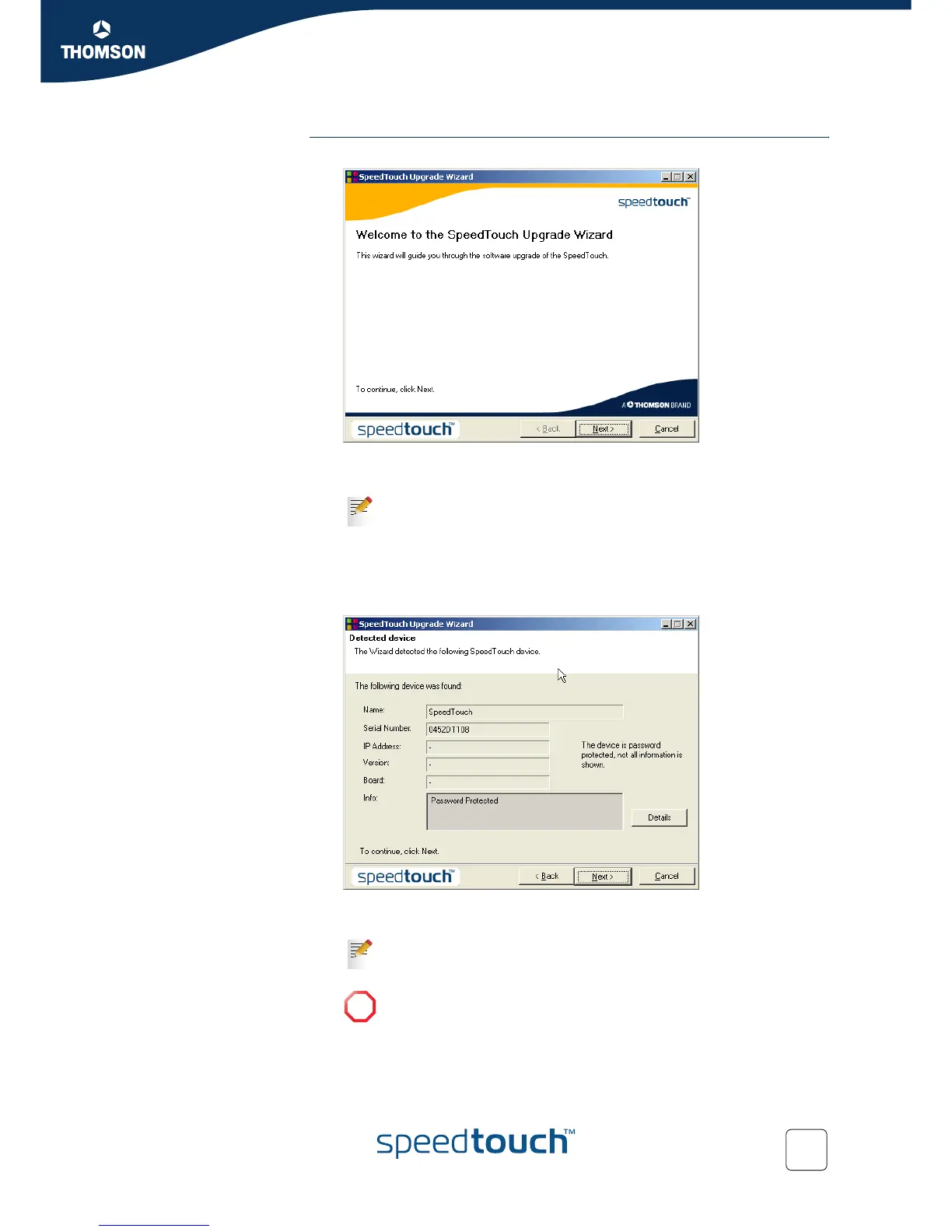 4 The SpeedTouch™ Upgrade Wizard should find your SpeedTouch™ device on
