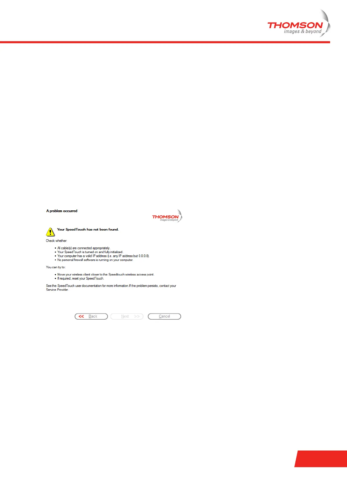 If the Home Install Wizard does not detect a connection to your Thomson Gateway, an error window appears.
