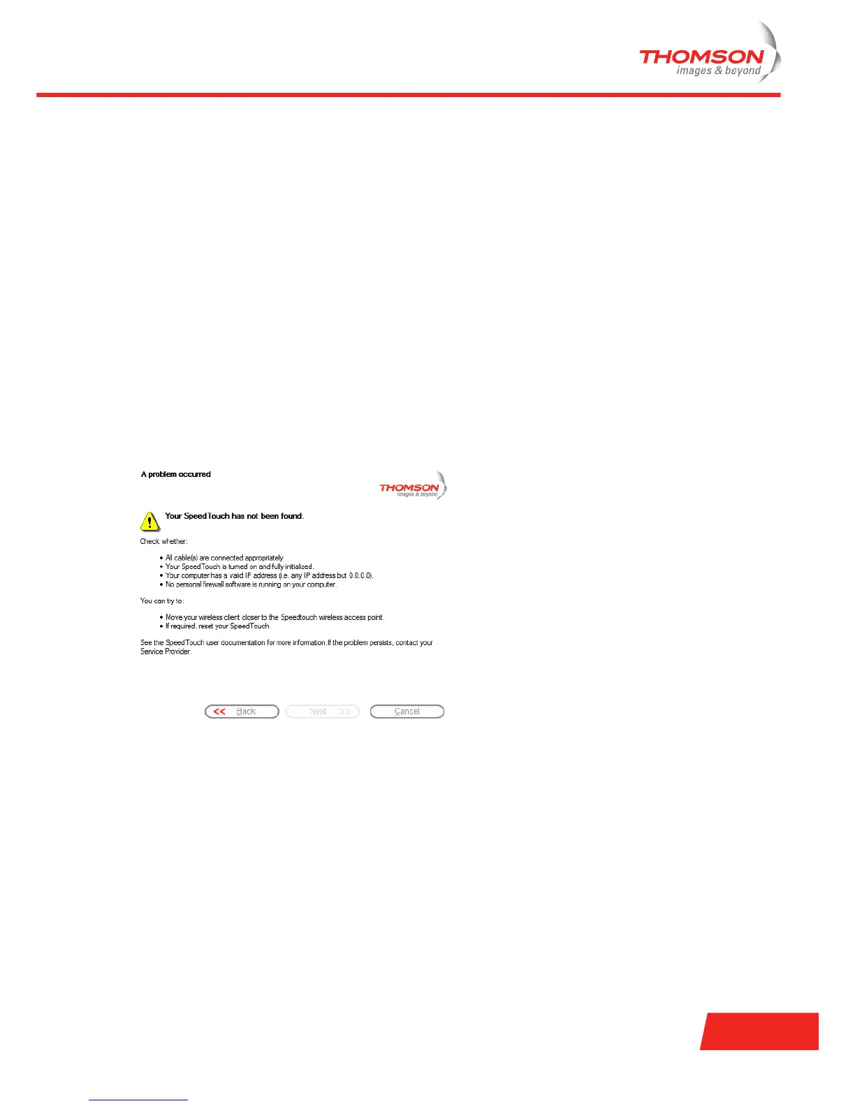 If the Home Install Wizard does not detect a connection to your Thomson Gateway, an error window appears.